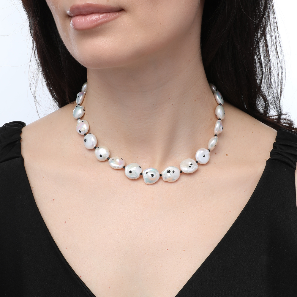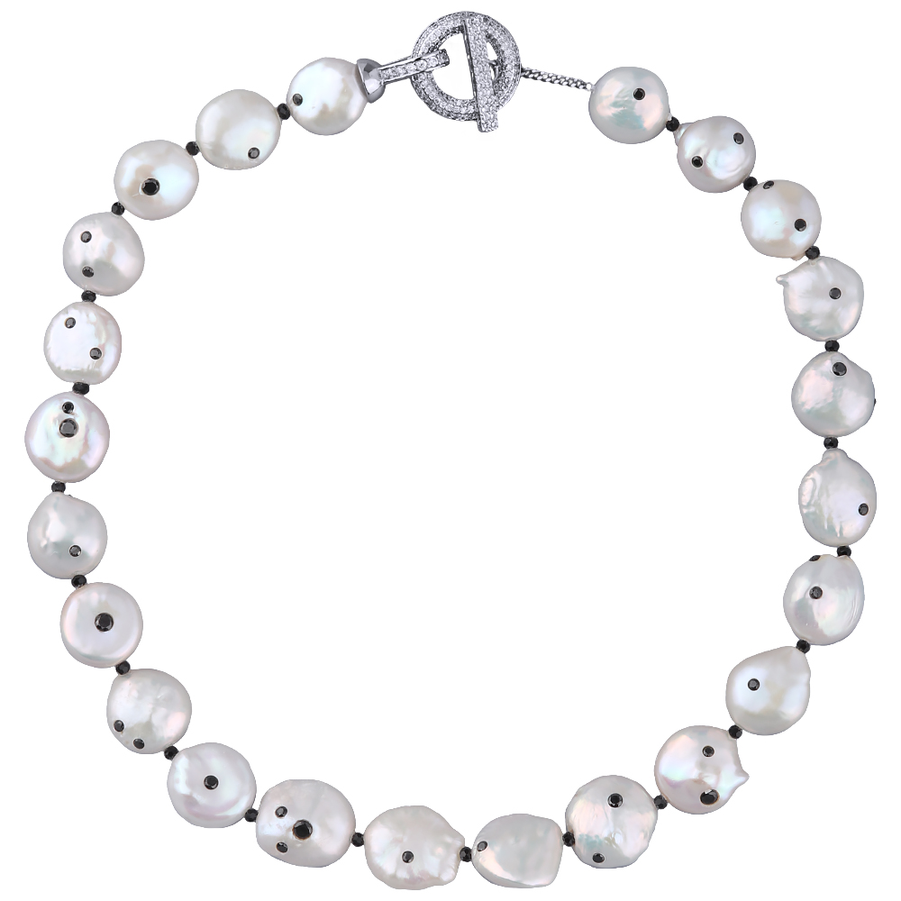 Описание: Изготовлено из ювелирного сплава на основе латуни с гальваническим покрытием родием. Изделие украшают барочный жемчуг, фианиты белого цвета и черные кристаллы. Длина колье 45см.