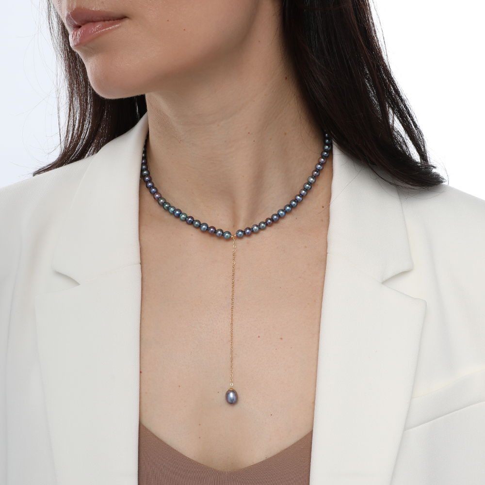 Описание: Изготовлено из ювелирного сплава на основе латуни с гальваническим покрытием золотом. Изделие украшает жемчуг диаметром 5-9мм бензинового цвета. Длина колье 38-45см.