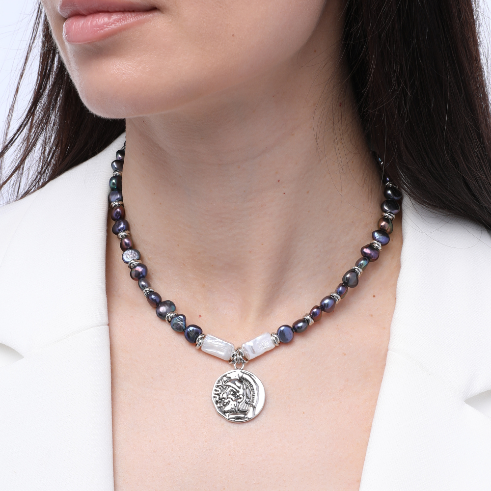 Описание: Изготовлено из ювелирного сплава на основе латуни с гальваническим покрытием родием. Изделие украшает бензиновый жемчуг диаметром 6мм. Длина 42см. Замок-карабин с удлинителем 5см.