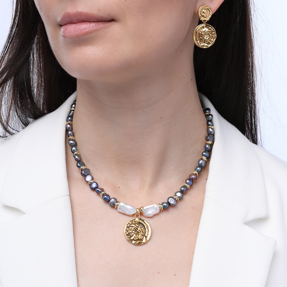 Описание: Изготовлено из ювелирного сплава на основе латуни с гальваническим покрытием золотом. Изделие украшает бензиновый перламутр диаметром 6мм. Длина колье 42см. Замок-карабин с удлинителем 5см. Диаметр кулона 25мм.