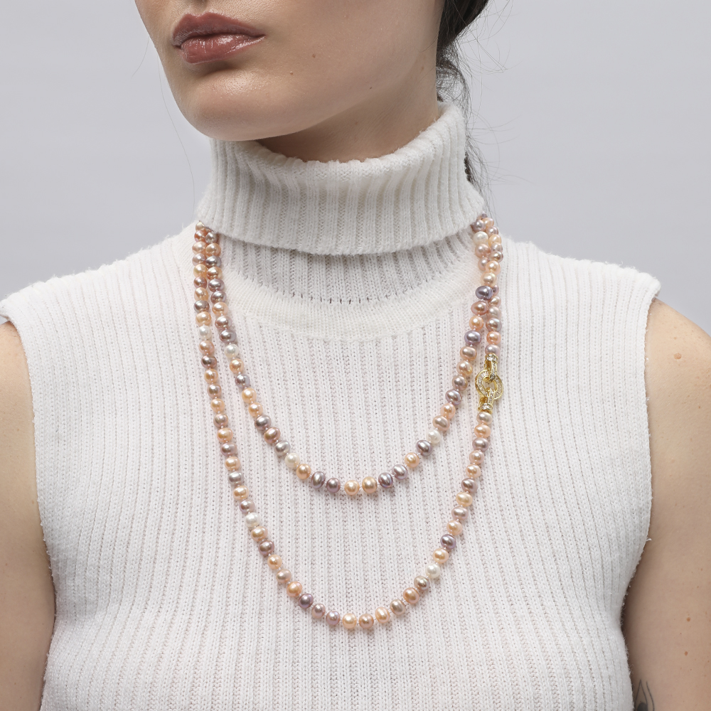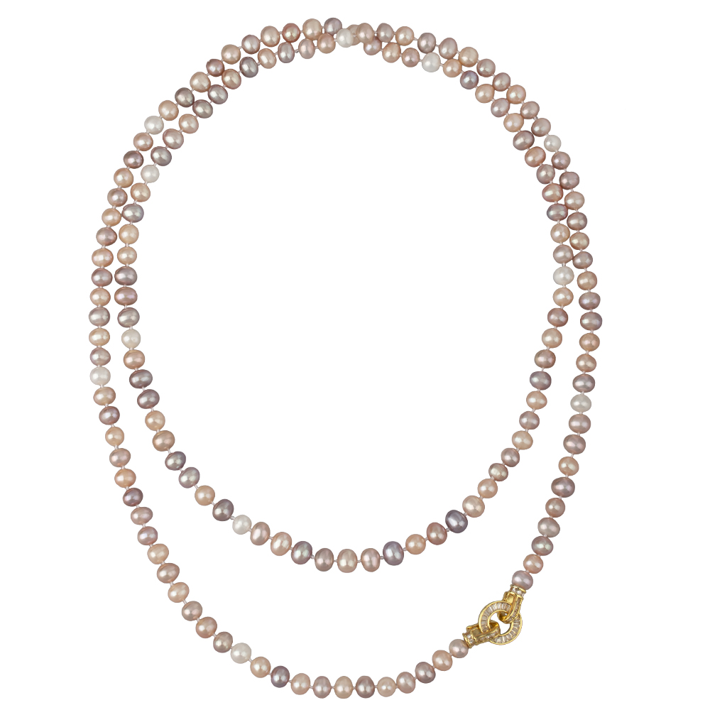 Описание: Изготовлено из ювелирного сплава на основе латуни с гальваническим покрытием золотом. Колье выполнено из натурального жемчуга высшего качества диаметром 7-8мм цвета розовый микс и украшено декоративным замком из фианита белого цвета. Длина 120см.