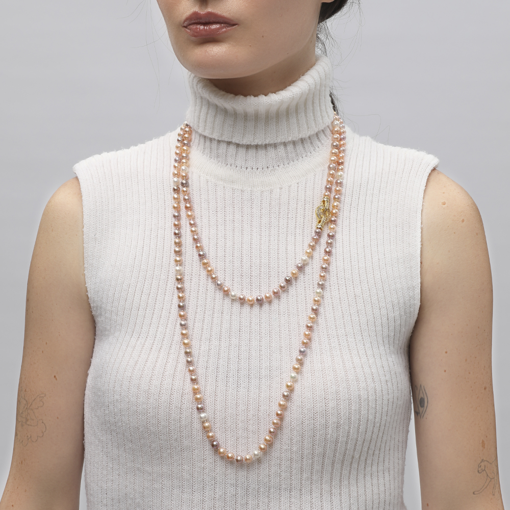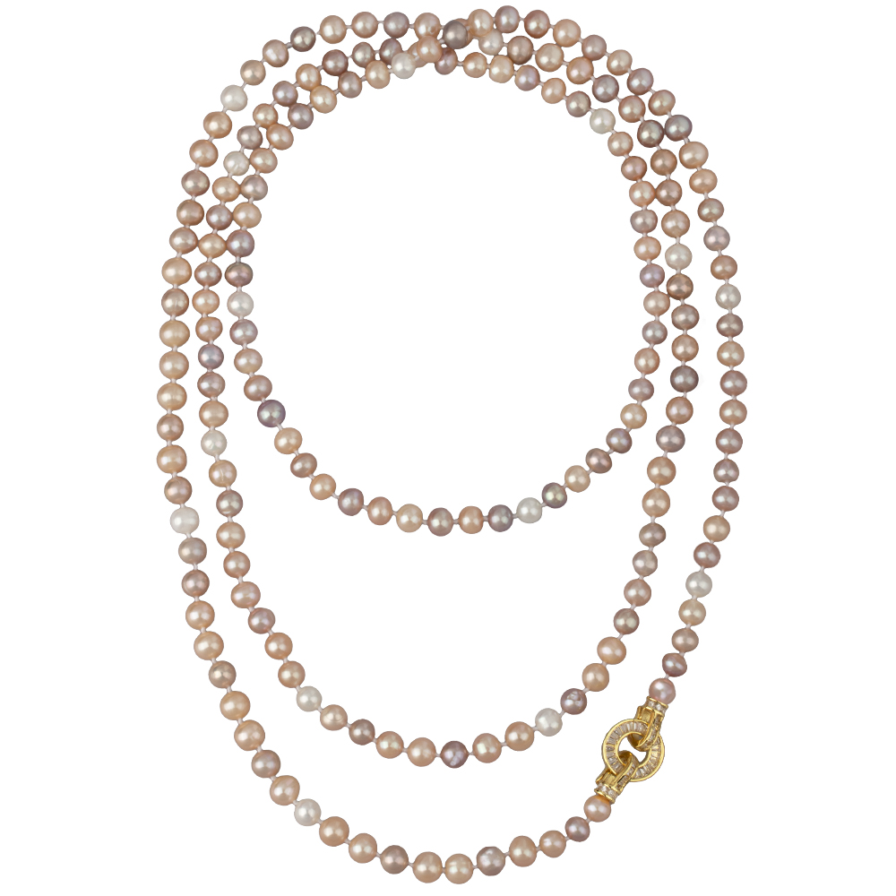 Описание: Изготовлено из ювелирного сплава на основе латуни с гальваническим покрытием золотом. Колье выполнено из натурального жемчуга высшего качества диаметром 7-8мм цвета розовый микс и украшено декоративным замком из фианита белого цвета. Длина 140см.