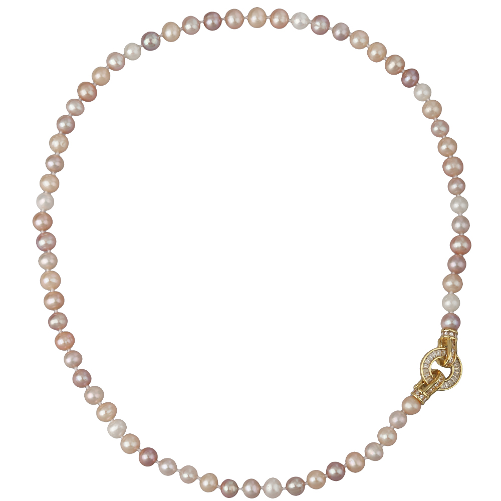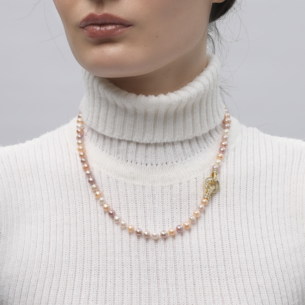 Описание: Изготовлено из ювелирного сплава на основе латуни с гальваническим покрытием золотом. Колье выполнено из натурального жемчуга высшего качества диаметром 7-8мм цвета розовый микс и украшено декоративным замком из фианита белого цвета. Длина 50см. *Цвет и ф