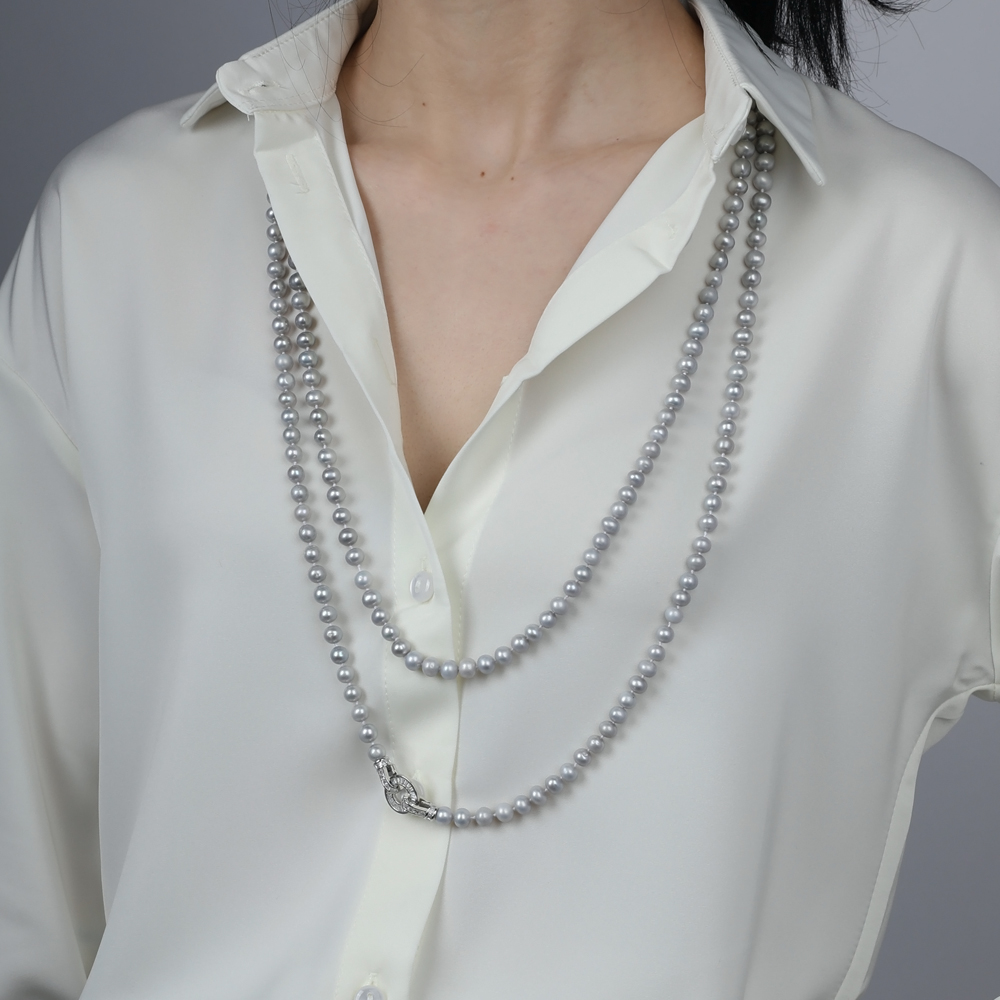Описание: Изготовлено из ювелирного сплава на основе латуни с гальваническим покрытием родием. Колье выполнено из натурального серо-голубого жемчуга высшего качества диаметром 7-8мм и украшено декоративным замком из фианита белого цвета. Длина 160см.