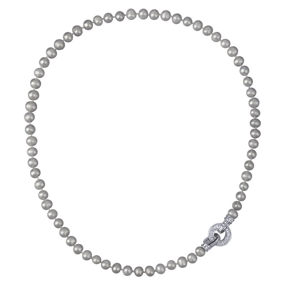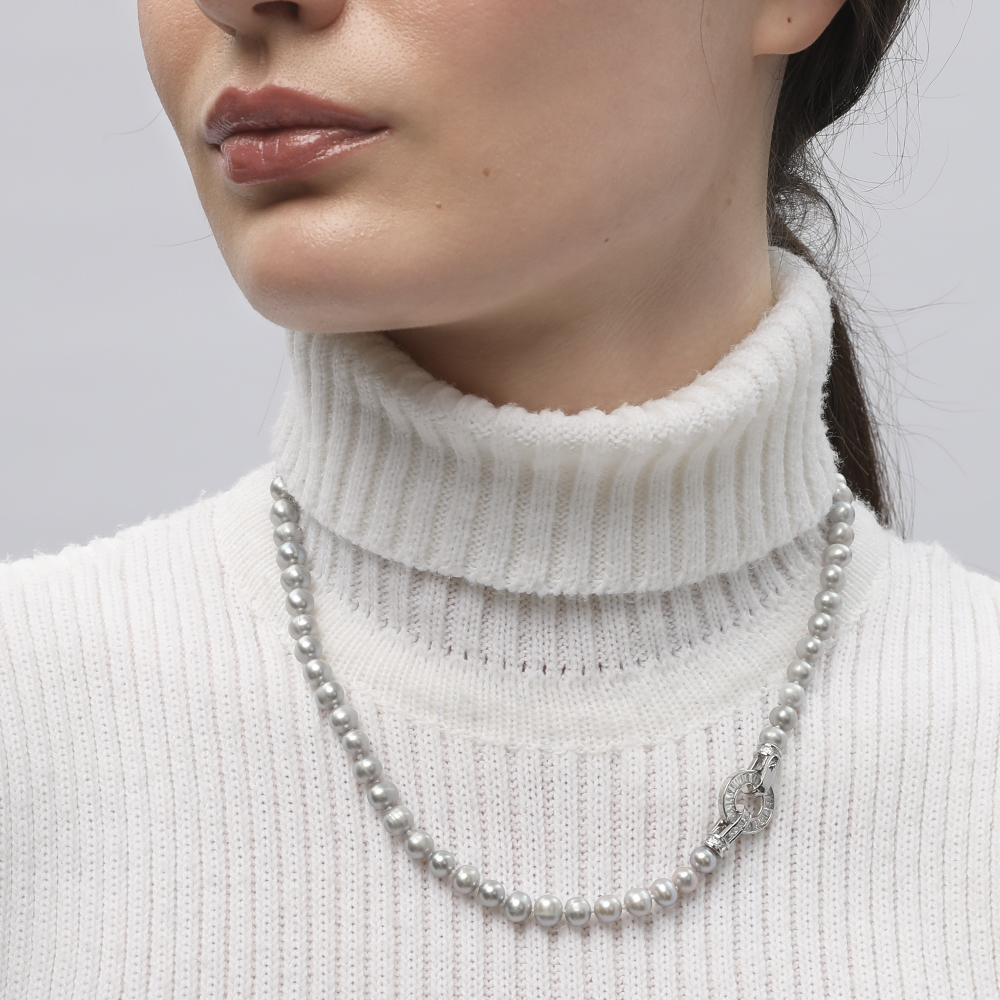 Описание: Изготовлено из ювелирного сплава на основе латуни с гальваническим покрытием родием. Колье выполнено из натурального серо-голубого жемчуга высшего качества диаметром 7-8мм и украшено декоративным замком из фианита белого цвета. Длина 50см.