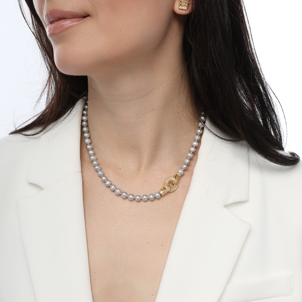 Описание: Изготовлено из ювелирного сплава на основе латуни с гальваническим покрытием золотом. Колье выполнено из натурального серо-голубого жемчуга высшего качества диаметром 7-8мм и украшено декоративным замком из фианитов белого цвета. Длина 45см.