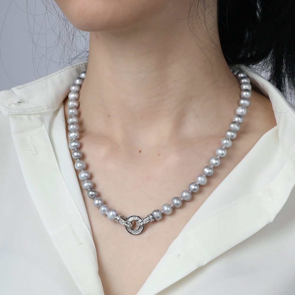 Описание: Изготовлено из ювелирного сплава на основе латуни с гальваническим покрытием родием. Колье выполнено из натурального серо-голубого жемчуга высшего качества диаметром 8-9мм и украшено декоративным замком из фианитов белого цвета. Длина 45см.*Цвет и форма ж
