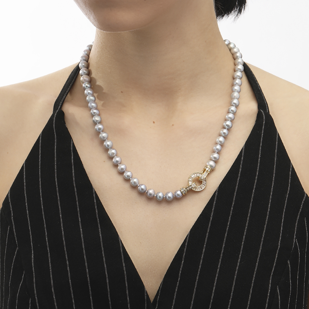 Описание: Изготовлено из ювелирного сплава на основе латуни с гальваническим покрытием золотом. Колье выполнено из натурального серо-голубого жемчуга высшего качества диаметром 8-9мм и украшено декоративным замком из фианитов белого цвета. Длина 50см.*Цвет и форма