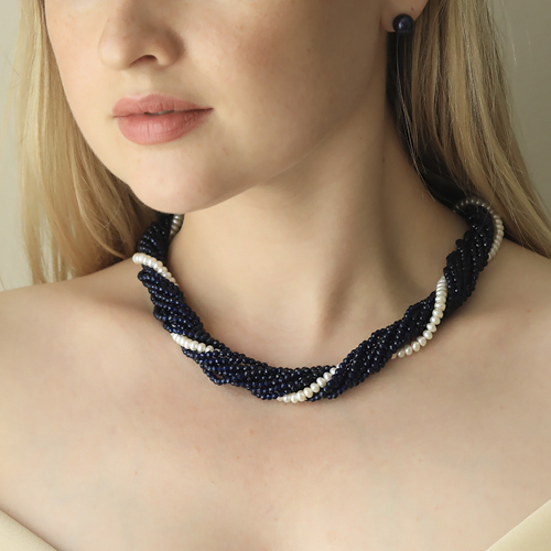 Описание: Изготовлено из ювелирного сплава на основе латуни с гальваническим покрытием черным родием. Изделие украшают белый жемчуг диаметром 5мм, шпинель и фианит синего цвета. Длина колье 50см.