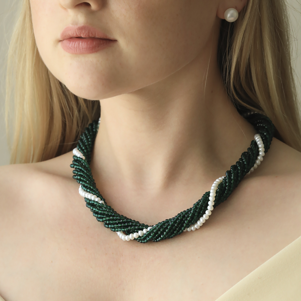 Описание: Изготовлено из ювелирного сплава на основе латуни с гальваническим покрытием черным родием. Изделие украшают белый жемчуг диаметром 5мм, шпинель и фианит зеленого цвета. Длина колье 50см.