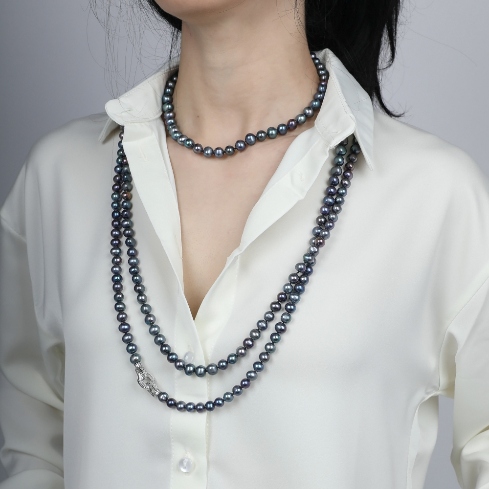 Описание: Изготовлено из ювелирного сплава на основе латуни с гальваническим покрытием родием. Колье выполнено из натурального сине-фиолетового жемчуга высшего качества диаметром 8-9мм и украшено декоративным замком из фианитов белого цвета. Длина 200см. *Цвет и фо