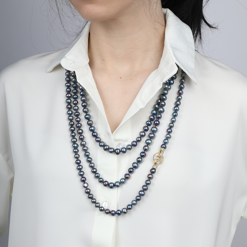 Описание: Изготовлено из ювелирного сплава на основе латуни с гальваническим покрытием золотом. Колье выполнено из натурального сине-фиолетового жемчуга высшего качества диаметром 8-9мм и украшено декоративным замком из фианитов белого цвета. Длина 200см. *Цвет и ф
