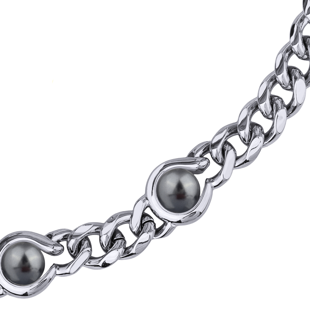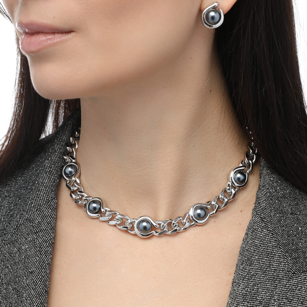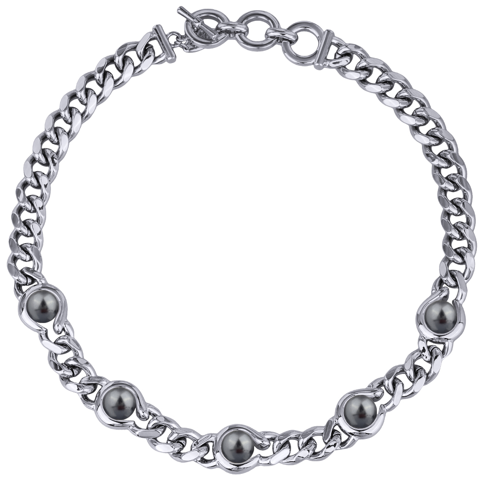 Описание: Изготовлено из ювелирного сплава на основе латуни с гальваническим покрытием родием. Изделие украшает майорский круглый жемчуг темно-серого цвета диаметром 12мм. Длина колье 41см. Застёжка-тогл с удлинителем 2см.