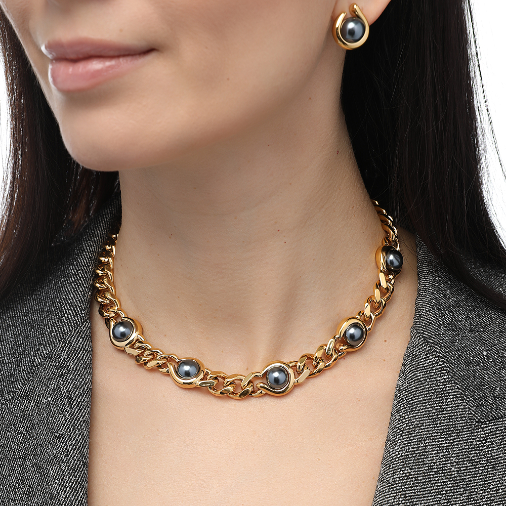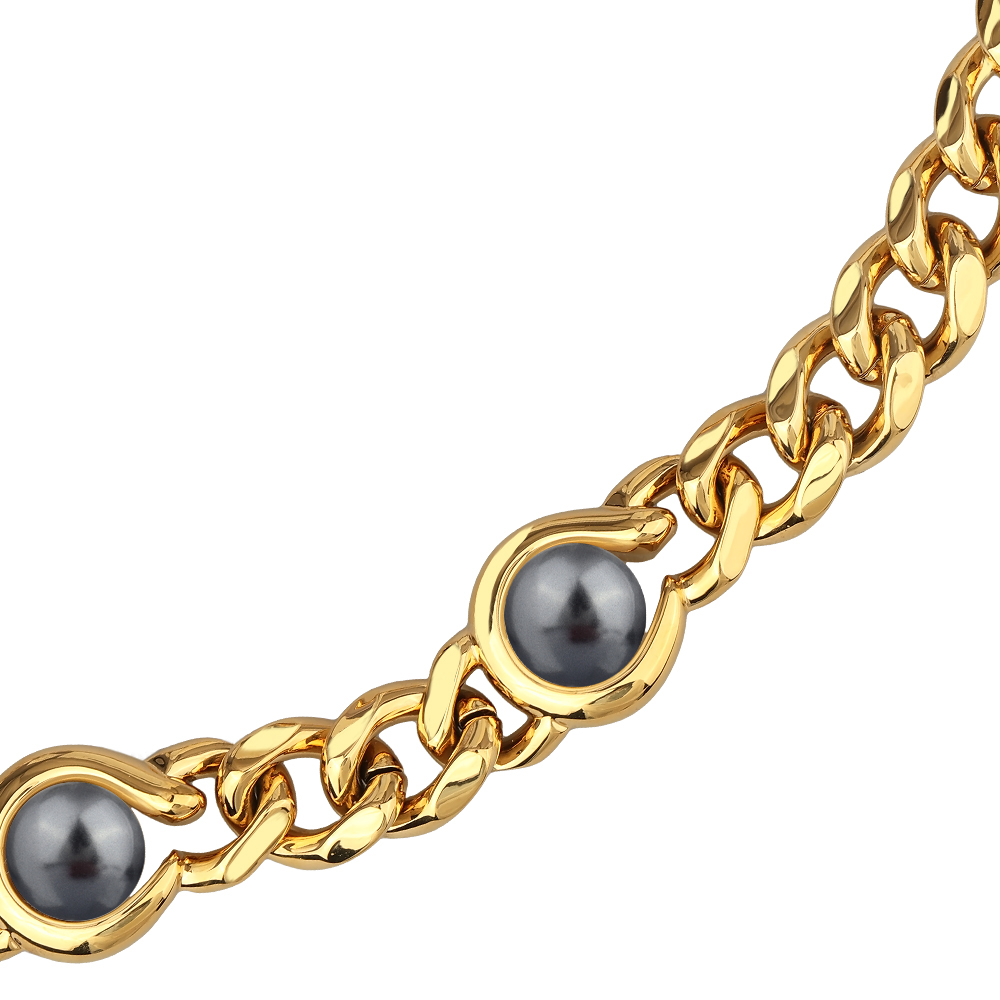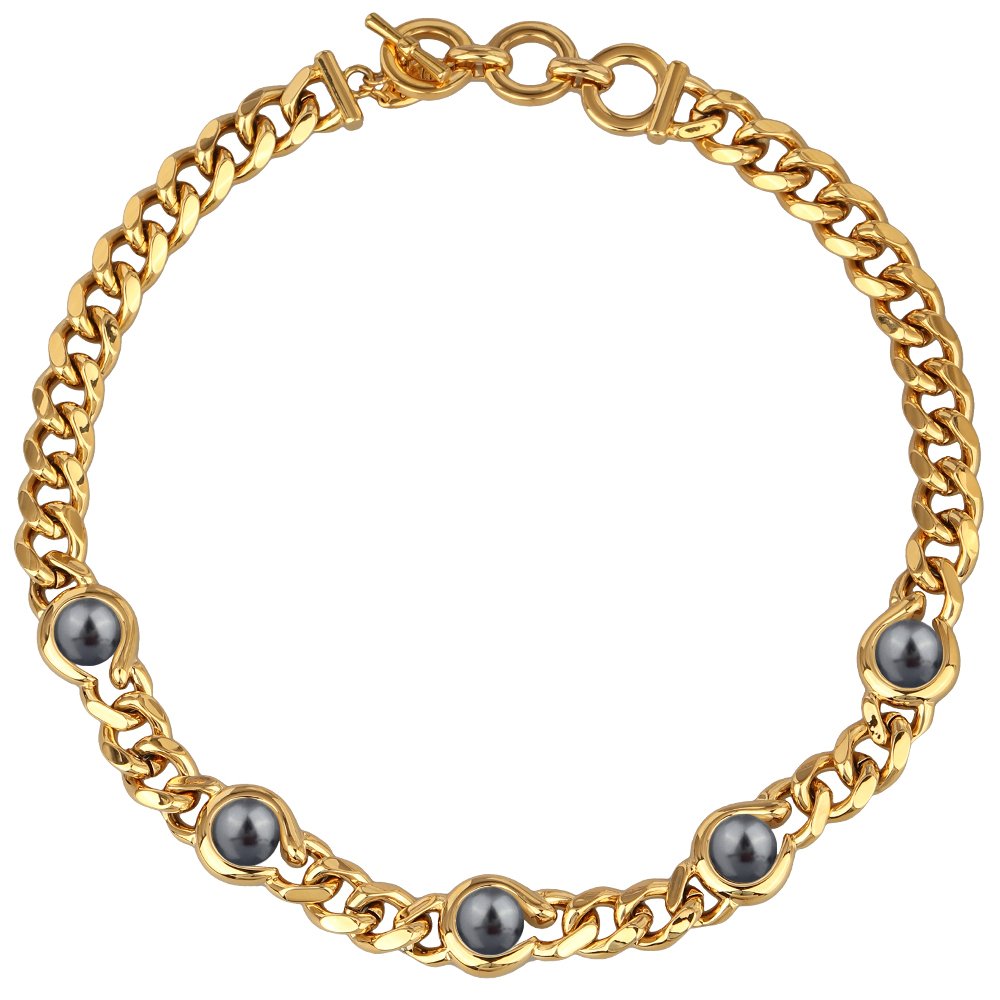 Описание: Изготовлено из ювелирного сплава на основе латуни с гальваническим покрытием золотом. Изделие украшает майорский круглый жемчуг темно-серого цвета диаметром мм. Длина колье 41см. Застёжка-тогл с удлинителем 2см.