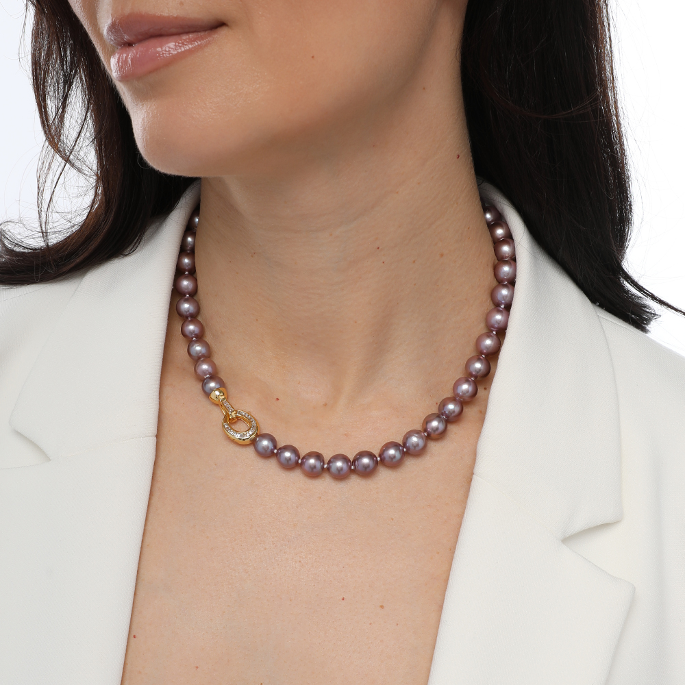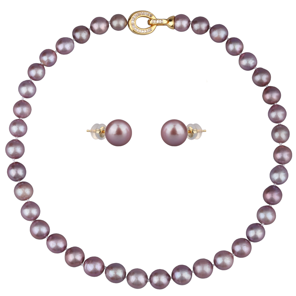 Описание: Изготовлено из ювелирного сплава на основе латуни с гальваническим покрытием золотом. Изделие украшает жемчуг диаметром 9-11мм цвета мускат. Длина колье 45см. Пусеты 9-10мм.