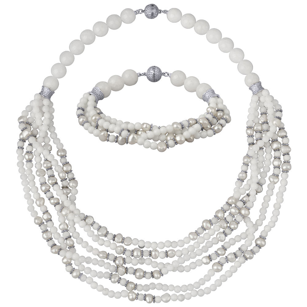 Описание: Изготовлено из ювелирного сплава на основе латуни с гальваническим покрытием родием. Изделие украшают агат и натуральный жемчуг белого цвета диаметром 6-8мм. Длина колье 45см. Длина браслета 20см.