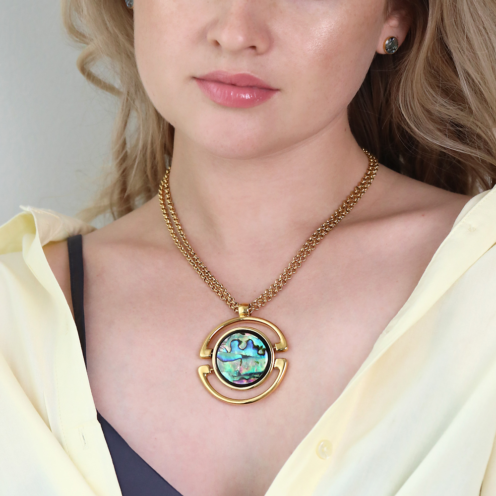 Описание: Изготовлено из ювелирного сплава на основе латуни с гальваническим покрытием золотом. Изделие украшает гелиотис. Длина цепочки 85см. Замок-карабин с удлинителем 5см. Диаметр кулона 5см.
