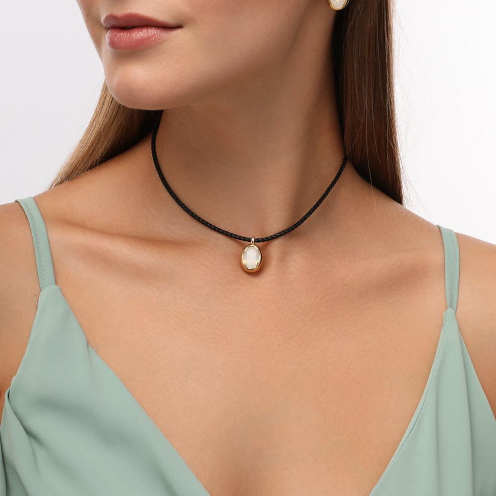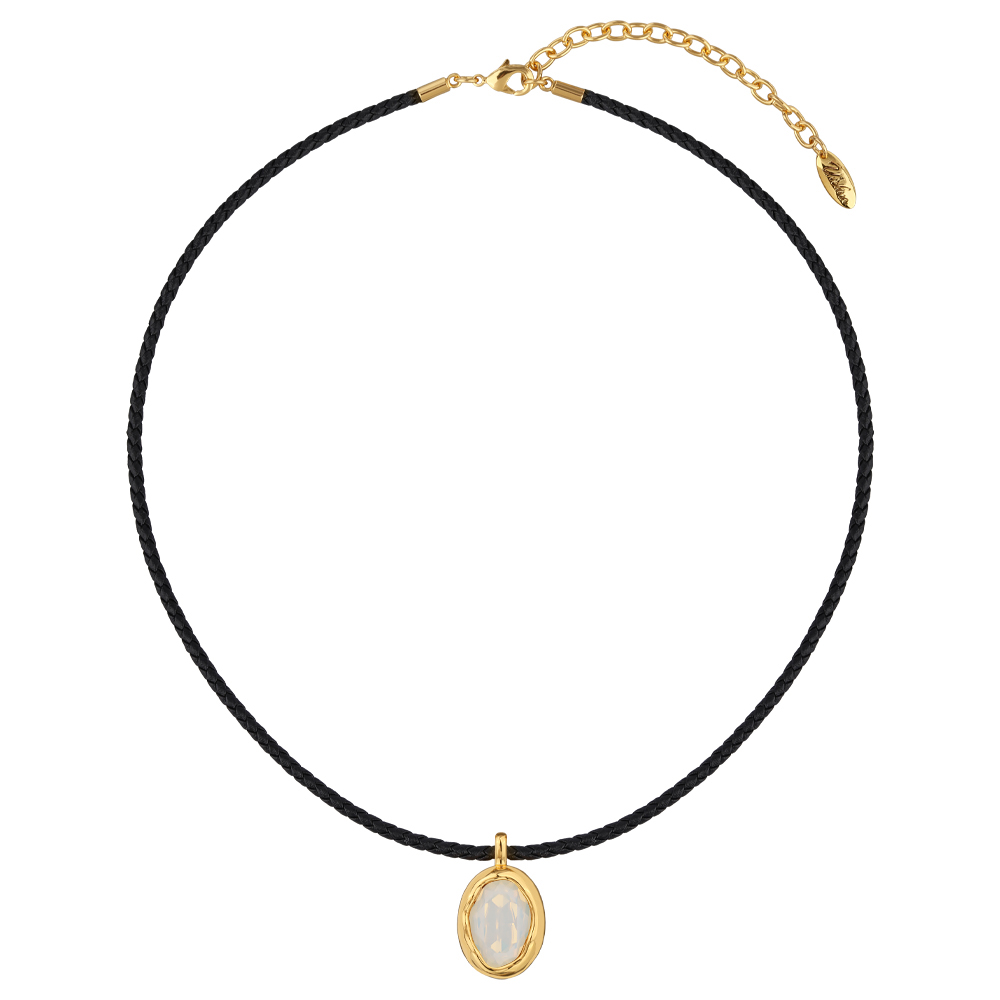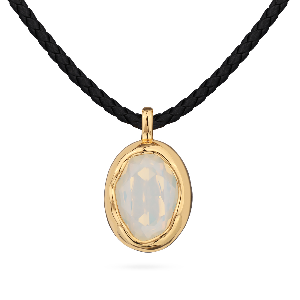 Описание: Изготовлено из ювелирного сплава на основе латуни с гальваническим покрытием золотом. Изделие украшают кристаллы SW цвета белый опал. Длина черного кожаного шнурка 38см. Удлинитель 7см. Размер кулона 1.7х1.4см.