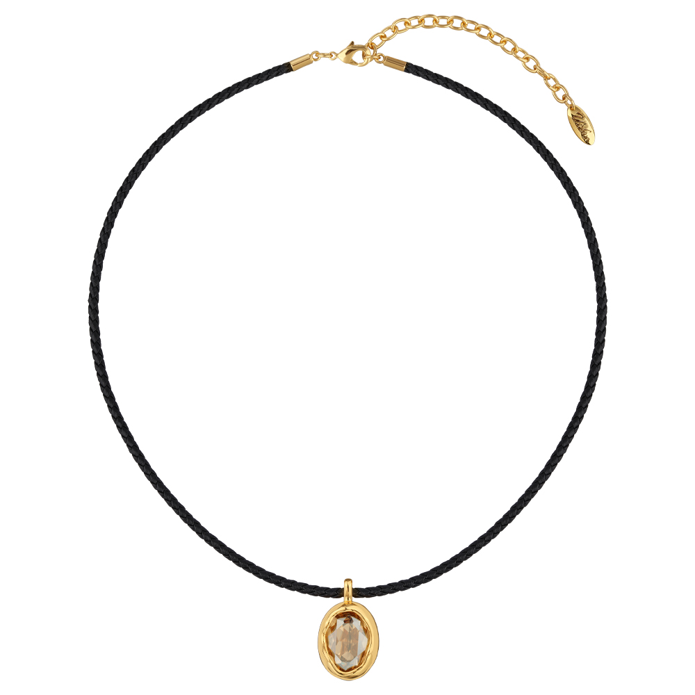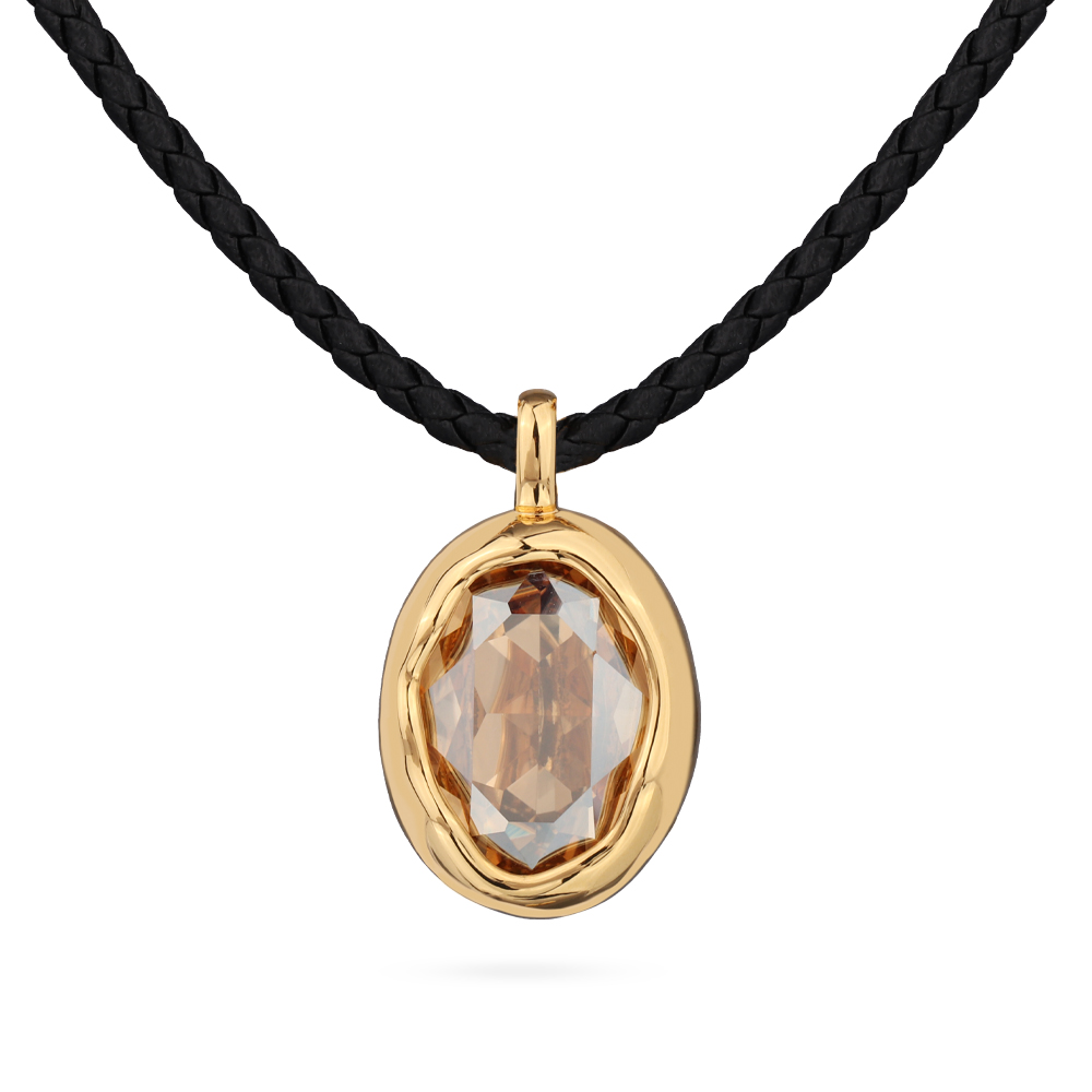 Описание: Изготовлено из ювелирного сплава на основе латуни с гальваническим покрытием золотом. Изделие украшают кристаллы SW цвета шампань. Длина черного кожаного шнурка 38см. Удлинитель 7см. Размер кулона 1.7х1.4см.