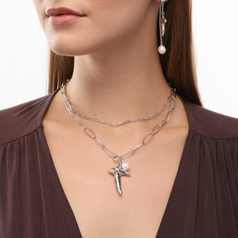 Описание: Изготовлено из ювелирного сплава на основе латуни с гальваническим покрытием родием. Изделие украшает натуральный жемчуг белого цвета диаметром 8-9мм. Размер украшения 4.5х2.5см. Длина цепочки 45см. Замок-карабин с удлинителем 5см.