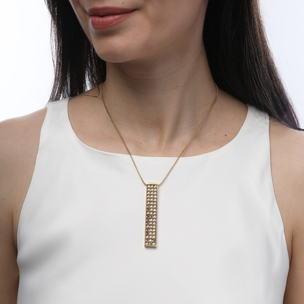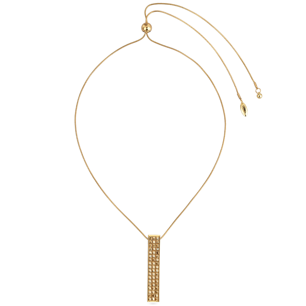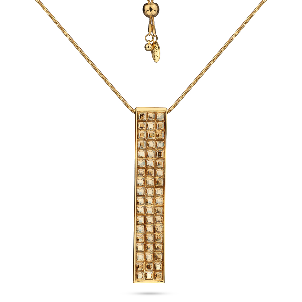 Описание: Изготовлено из ювелирного сплава на основе латуни с гальваническим покрытием золотом. Изделие украшают кристаллы SW шампань цвета. На цепочке установлен регулятор длины. Максимальная длина цепочки 80см. Размер кулона 6, 5х1см.