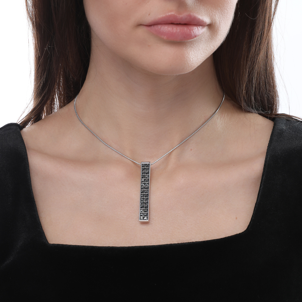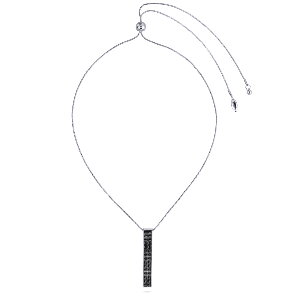 Описание: Изготовлено из ювелирного сплава на основе латуни с гальваническим покрытием родием. Изделие украшают кристаллы SW темно-серого цвета. На цепочке установлен регулятор длины. Максимальная длина цепочки 80см. Размер кулона 5.5х0.8см.