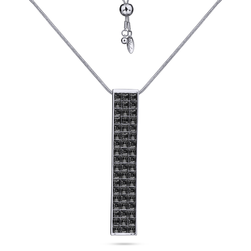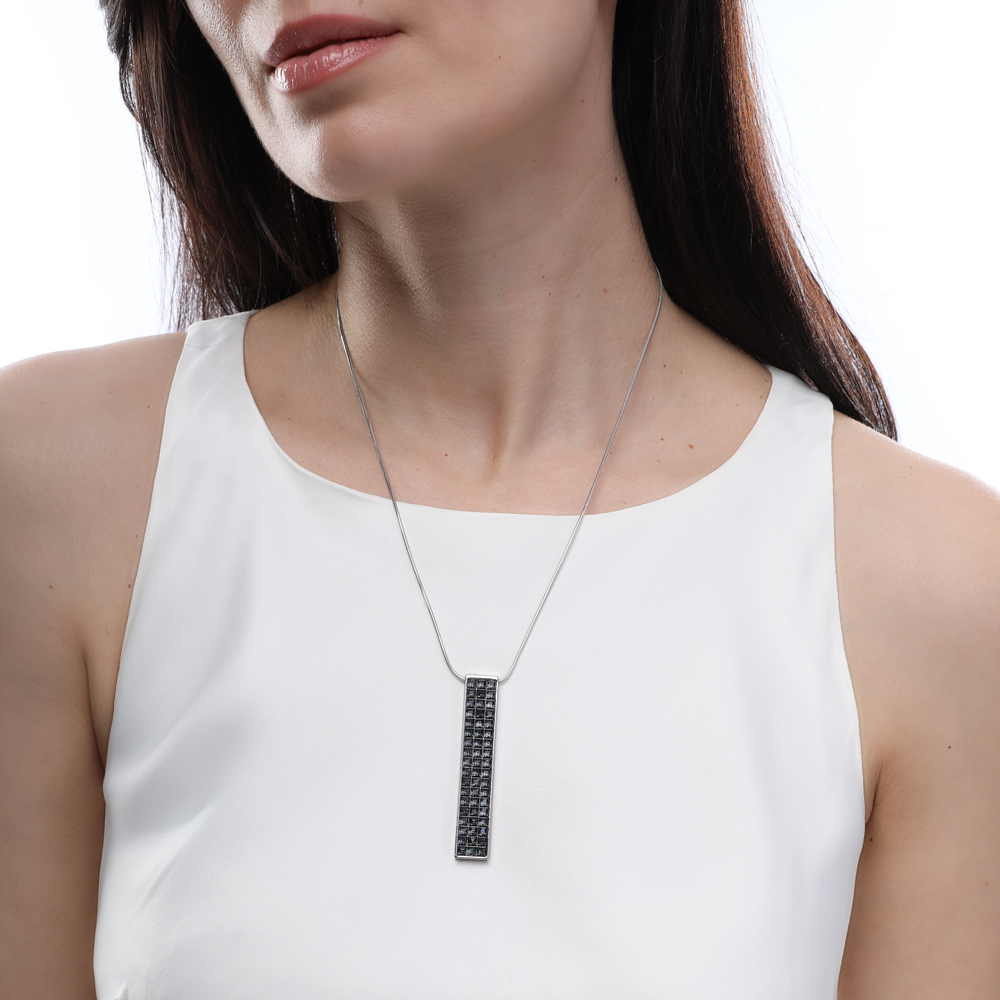 Описание: Изготовлено из ювелирного сплава на основе латуни с гальваническим покрытием родием. Изделие украшают кристаллы SW темно-серого цвета. На цепочке установлен регулятор длины. Максимальная длина цепочки 80см. Размер кулона 6.5х1см.