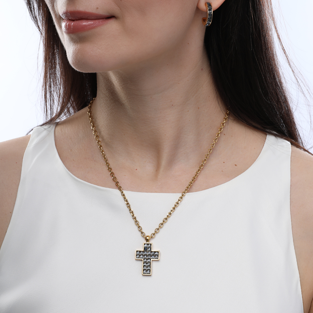 Описание: Изготовлено из ювелирного сплава на основе латуни с гальваническим покрытием золотом. Изделие украшают кристаллы SW темно-серого цвета. Длина цепочки 50см. Размер кулона 3.2х2.2см.
