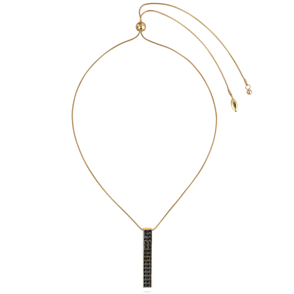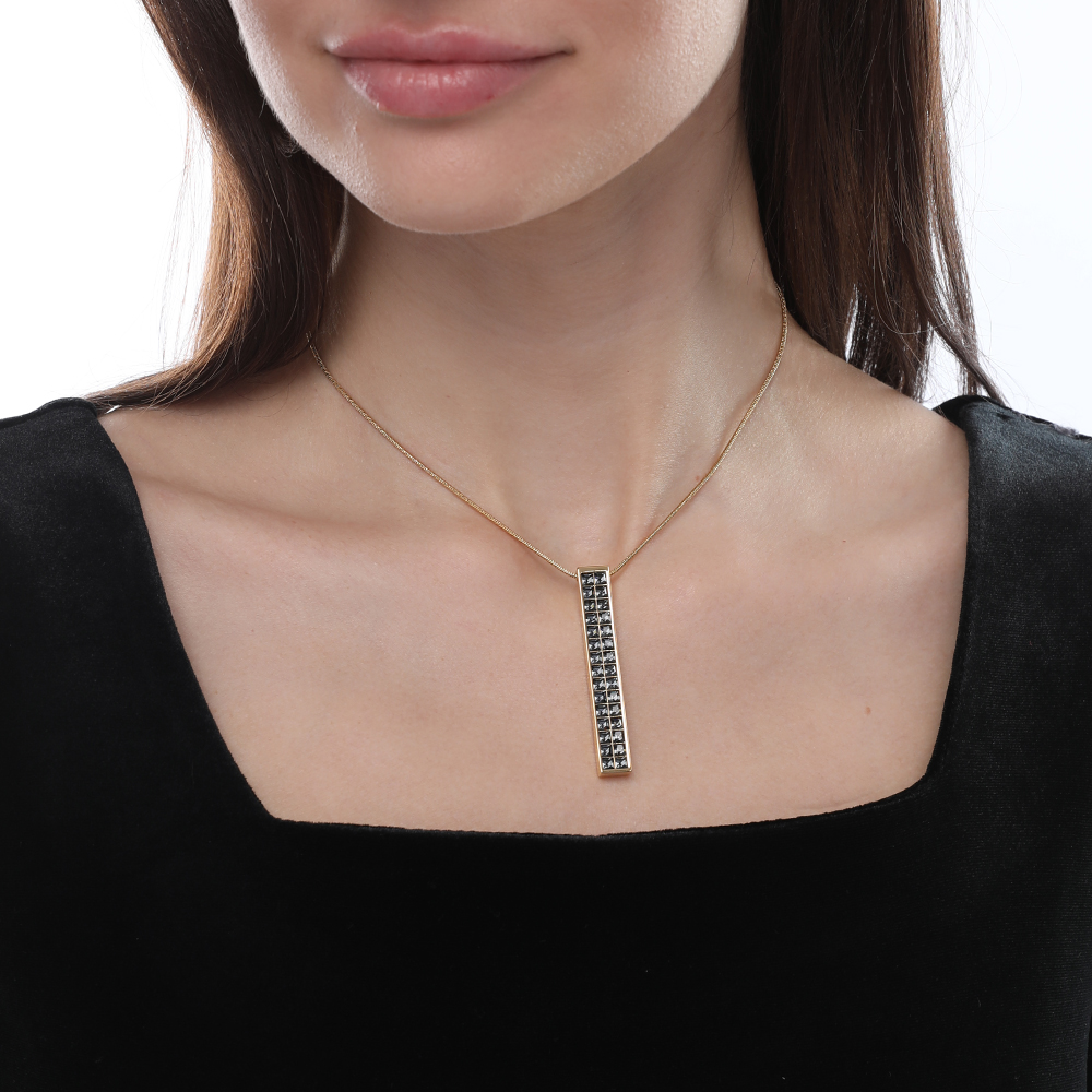 Описание: Изготовлено из ювелирного сплава на основе латуни с гальваническим покрытием золотом. Изделие украшают кристаллы SW темно-серого цвета. На цепочке установлен регулятор длины. Максимальная длина цепочки 80см. Размер кулона 5.5х0.8см.