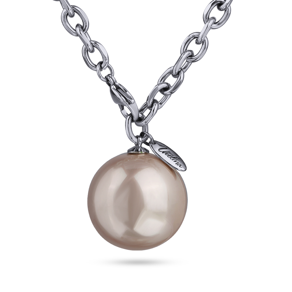 Описание: Изготовлено из ювелирного сплава на основе латуни с гальваническим покрытием родием. Изделие украшает жемчуг Майорка цвета шампань диаметром 25мм. Длина цепочки 95см.