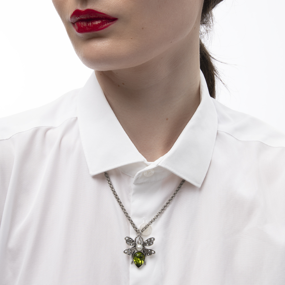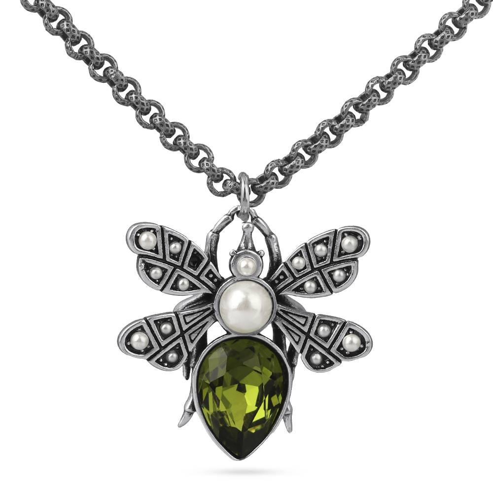 Описание: Изготовлено из ювелирного сплава на основе латуни с гальваническим покрытием античным серебром. Изделие украшают кристаллы SW зеленого цвета и белый майорский жемчуг диаметром 6мм. Длина цепочки 50см. Размер кулона 3.5х3см.