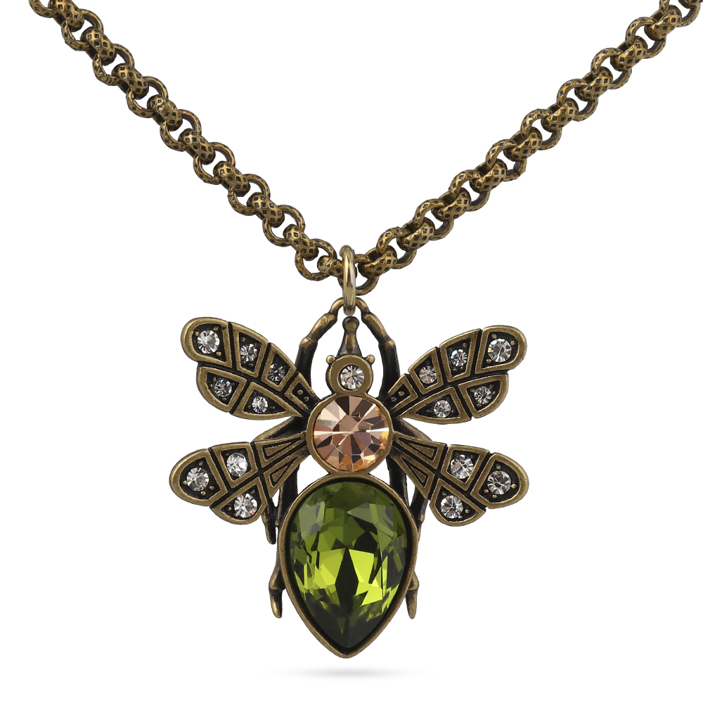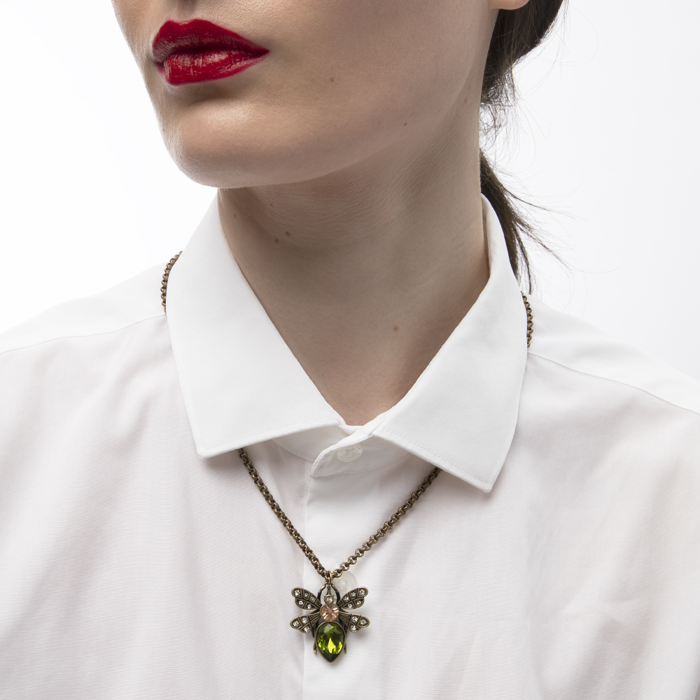 Описание: Изготовлено из ювелирного сплава на основе латуни с гальваническим покрытием бронзой. Изделие украшают кристаллы SW зеленого и шампань цвет. Длина цепочки 50см. Размер кулона 3.5х3см.
