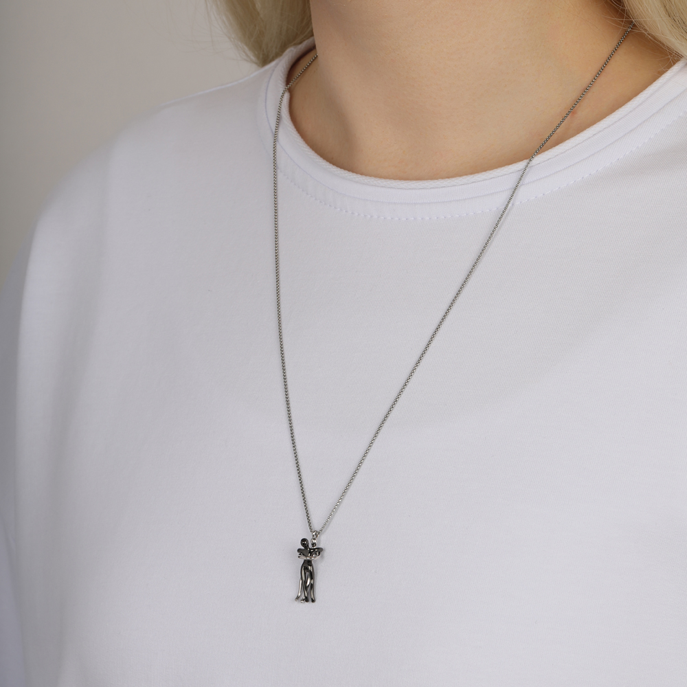 Описание: Изготовлено из ювелирного сплава на основе латуни с гальваническим покрытием родием и черным родием. Длина цепи регулируется. Максимальная длина 64см. Длина кулона 2.5см.