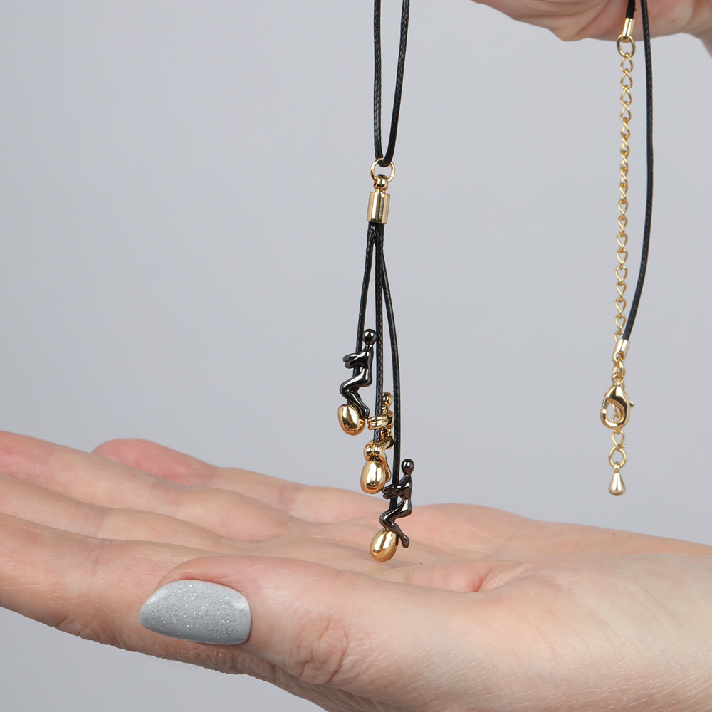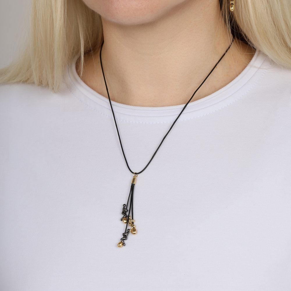 Описание: Изготовлено из ювелирного сплава на основе латуни с гальваническим покрытием золотом и черным родием. Длина черного текстильного шнурка 52см. Замок-карабин с удлинителем 5см. Длина кулона 6см.
