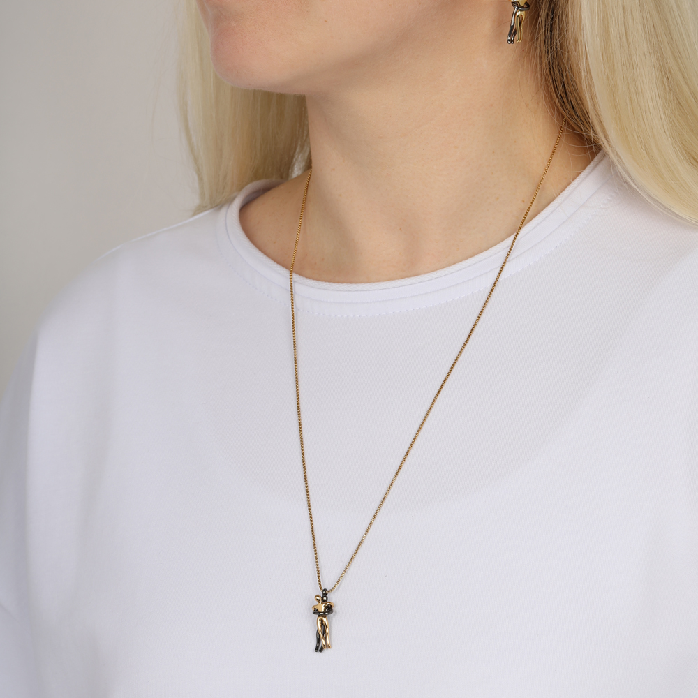 Описание: Изготовлено из ювелирного сплава на основе латуни с гальваническим покрытием золотом и черным родием. Длина цепи регулируется. Максимальная длина 64см. Длина кулона 2.5см.