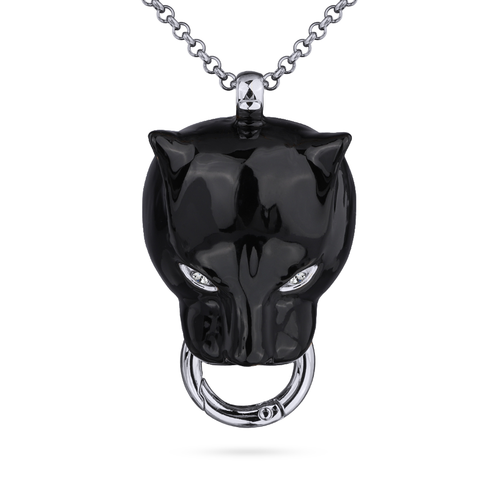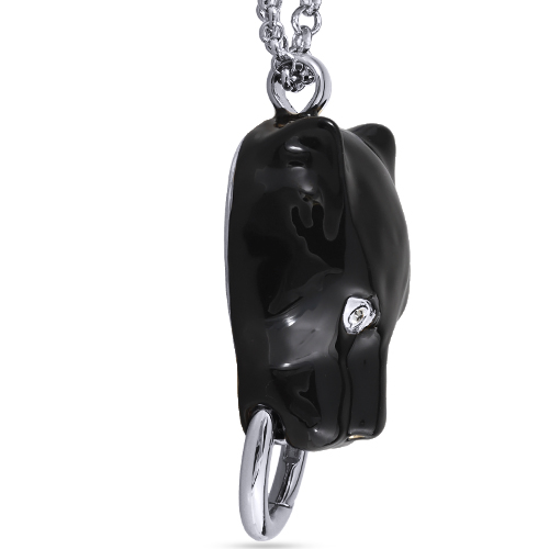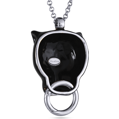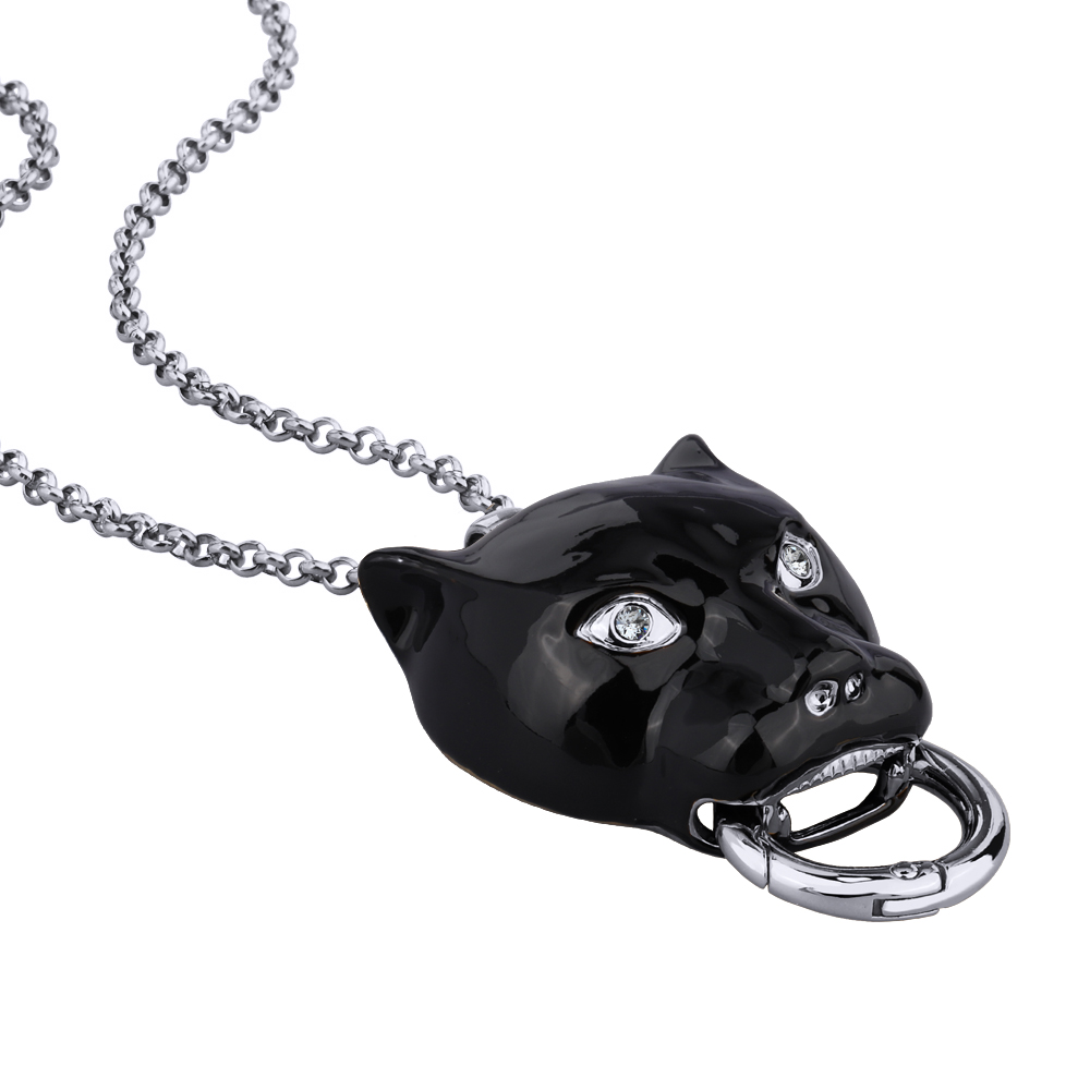 Описание: Изготовлено из ювелирного сплава на основе латуни с гальваническим покрытием родием. Изделие покрыто эмалью черного цвета и украшено белыми кристаллами SW. Размер украшения 5х3, 5см. Длина цепи 85см. Замок-карабин с удлинителем 5см.