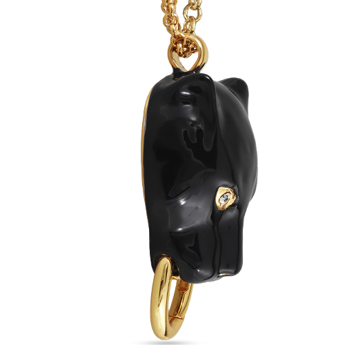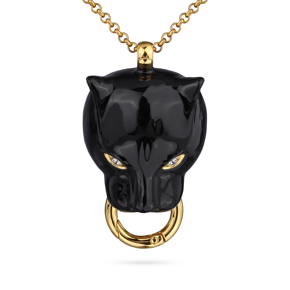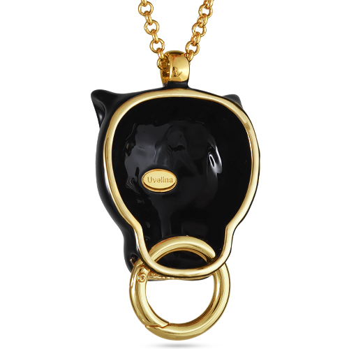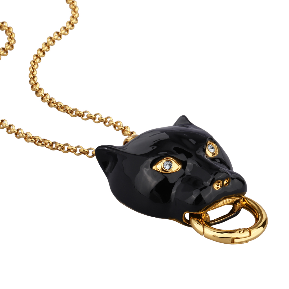 Описание: Изготовлено из ювелирного сплава на основе латуни с гальваническим покрытием золотом. Изделие покрыто эмалью черного цвета и украшено белыми кристаллами SW. Размер украшения 5х3, 5см. Длина цепи 80см. Замок-карабин с удлинителем 5см.