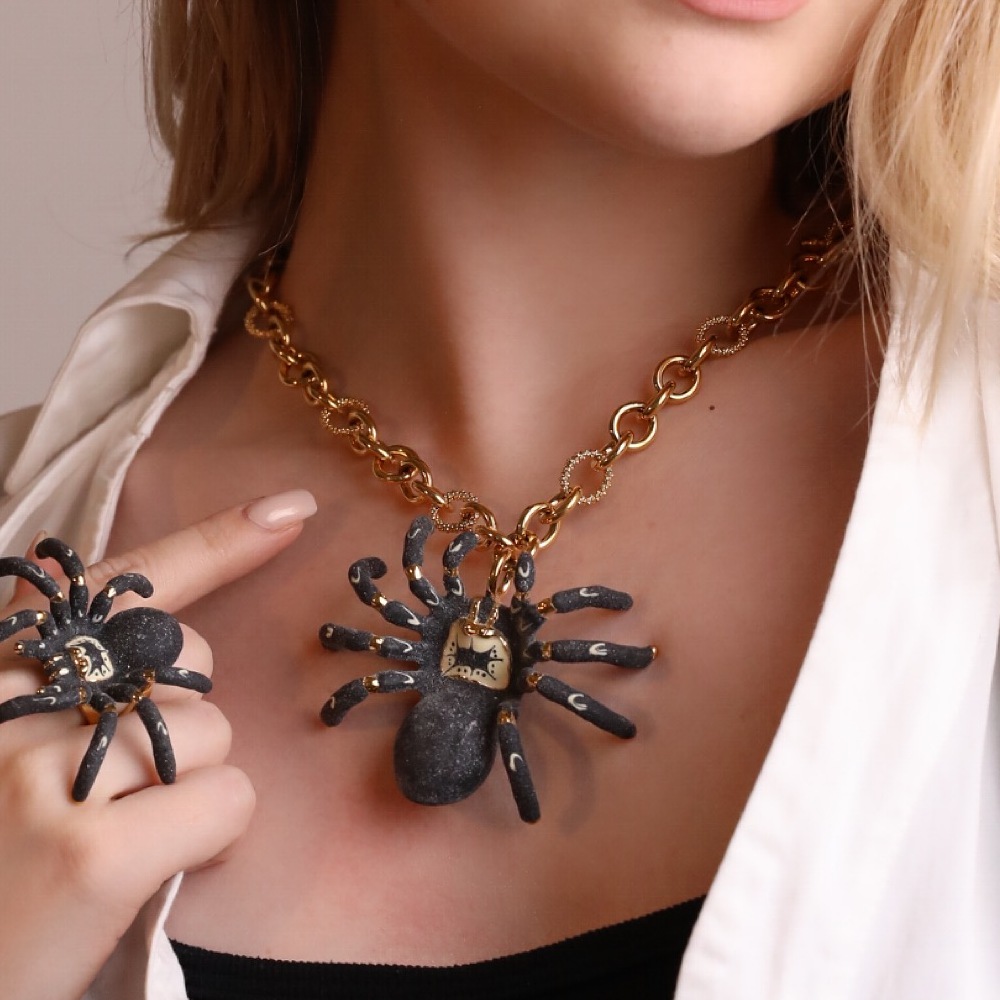 Описание: Изготовлено из ювелирного сплава на основе латуни с гальваническим покрытием золотом. Изделие украшает эмаль матового черного и белого цвета. Длина 80см. Удлинитель 4см. Размер кулона 6х8см.