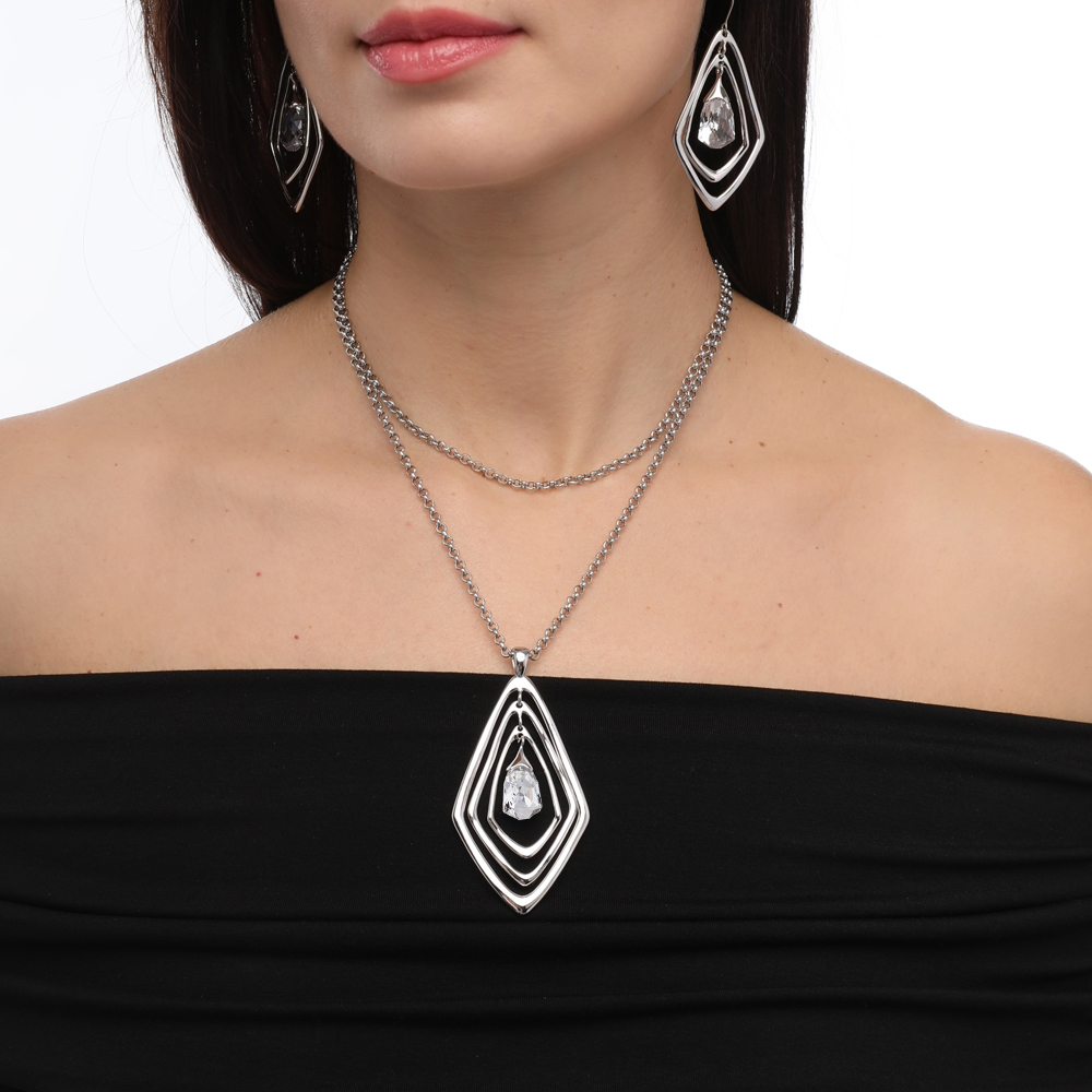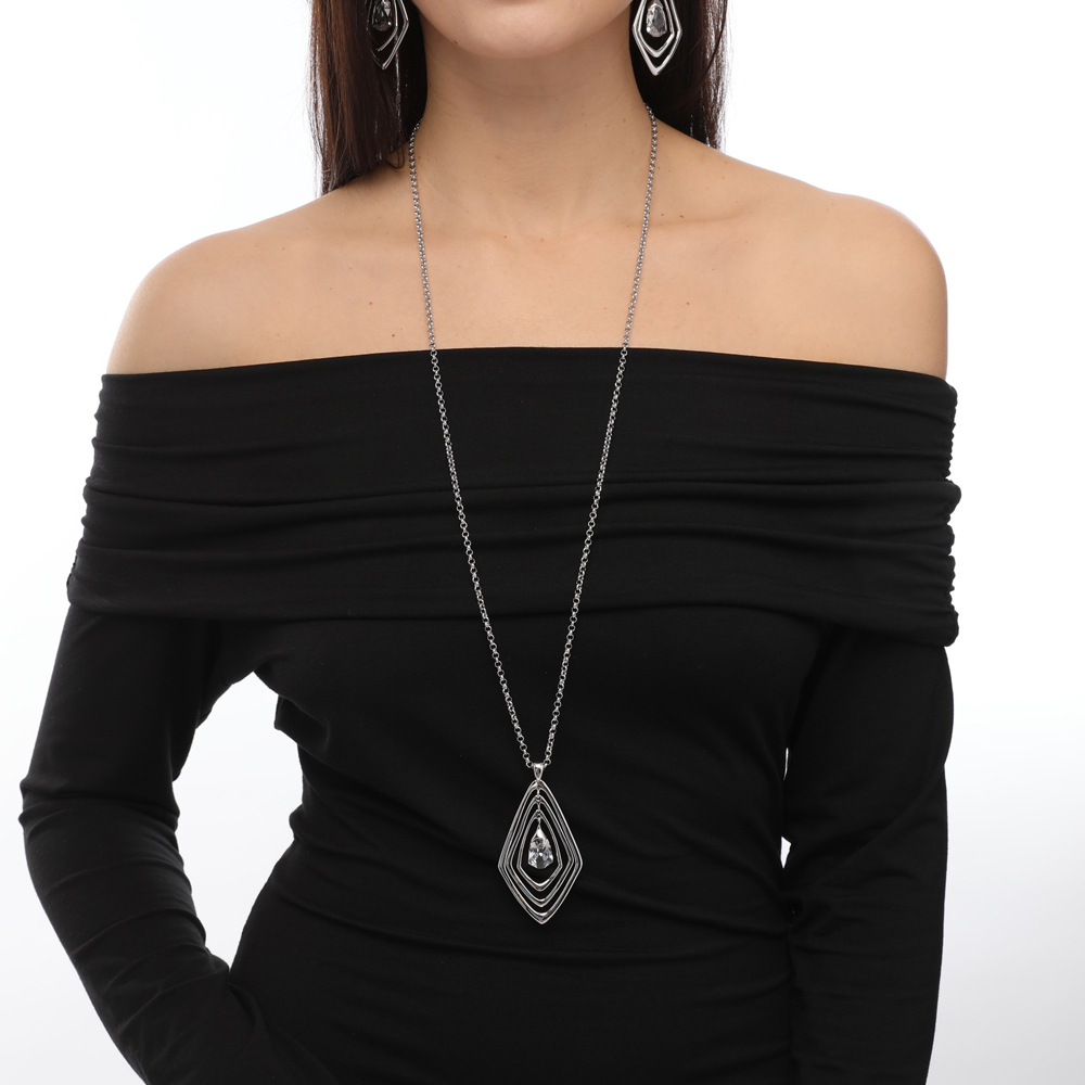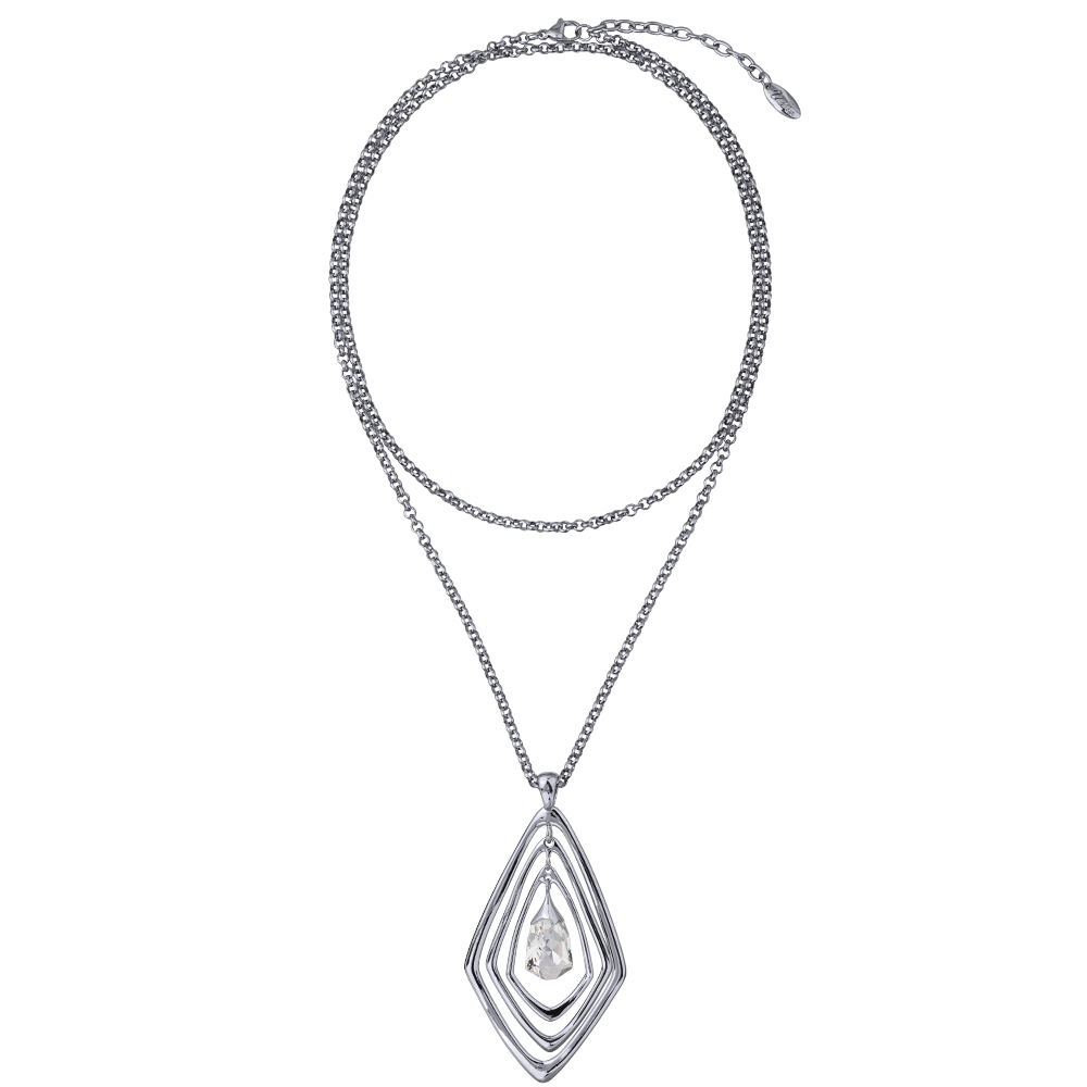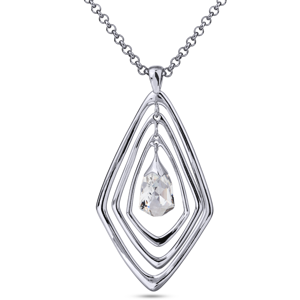 Описание: Изготовлено из ювелирного сплава на основе латуни с гальваническим покрытием родием. Изделие украшают кристаллы SW белого цвета. Длина цепочки 88см. Замок-карабин с удлинителем 5см. Кулон 8х4см.