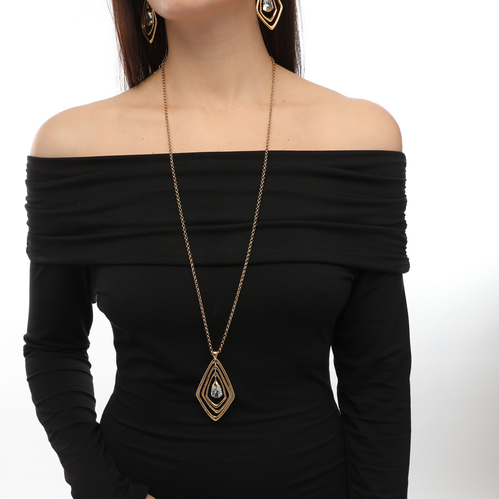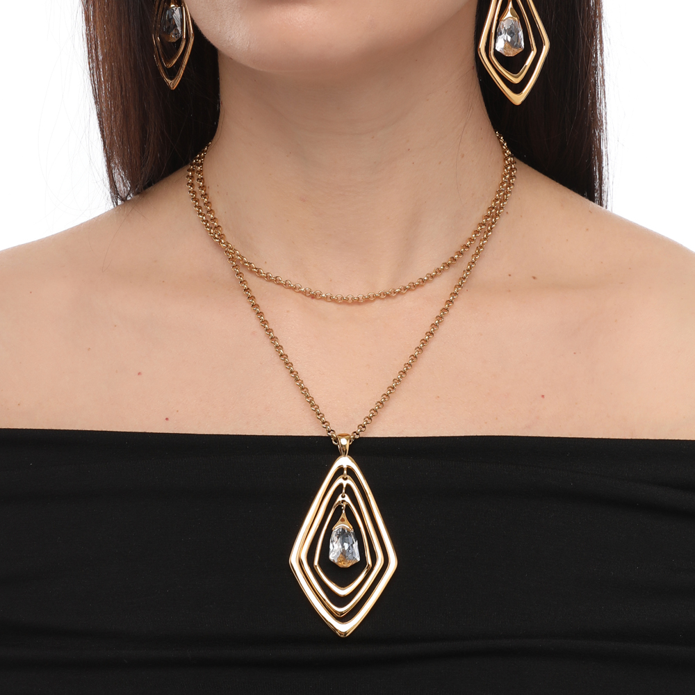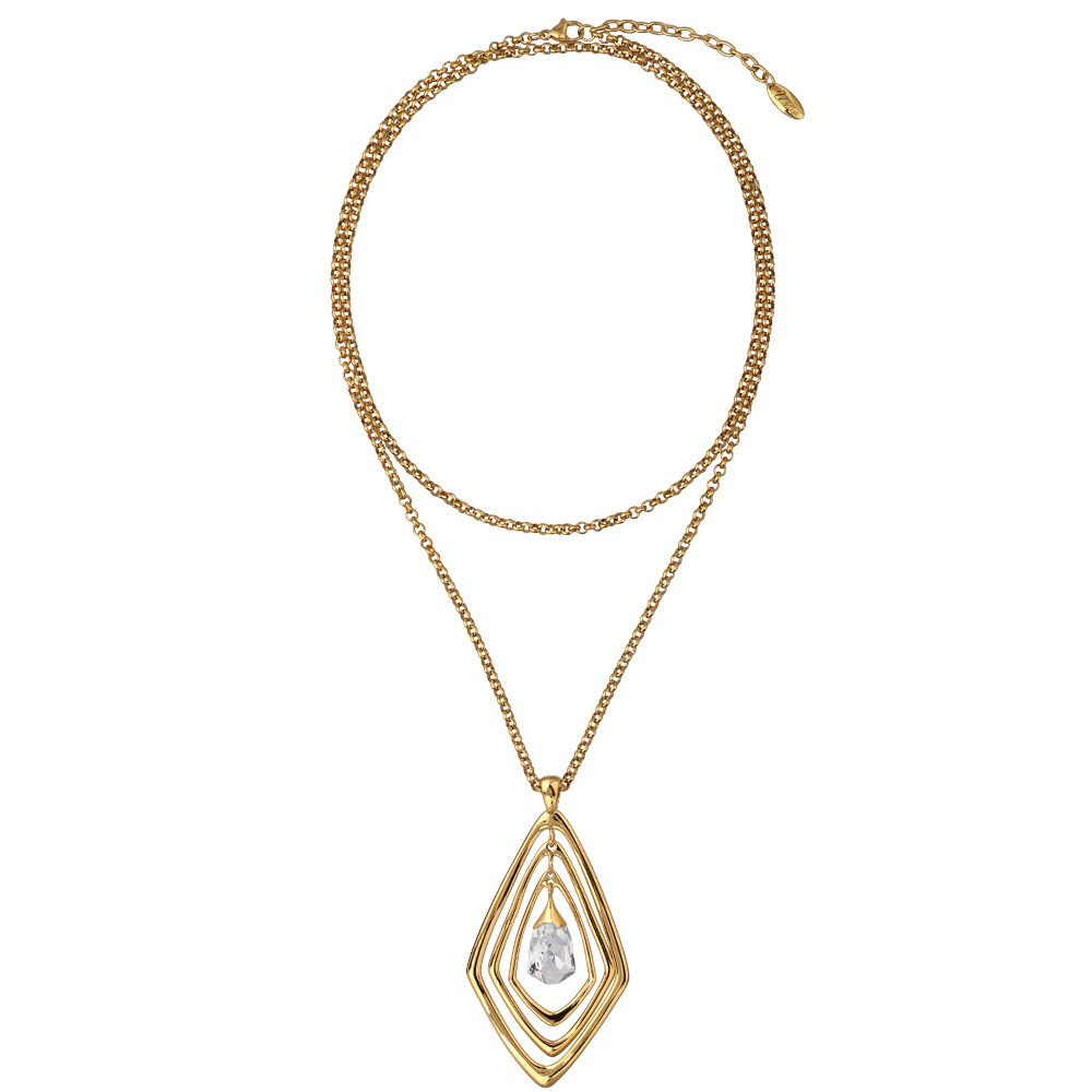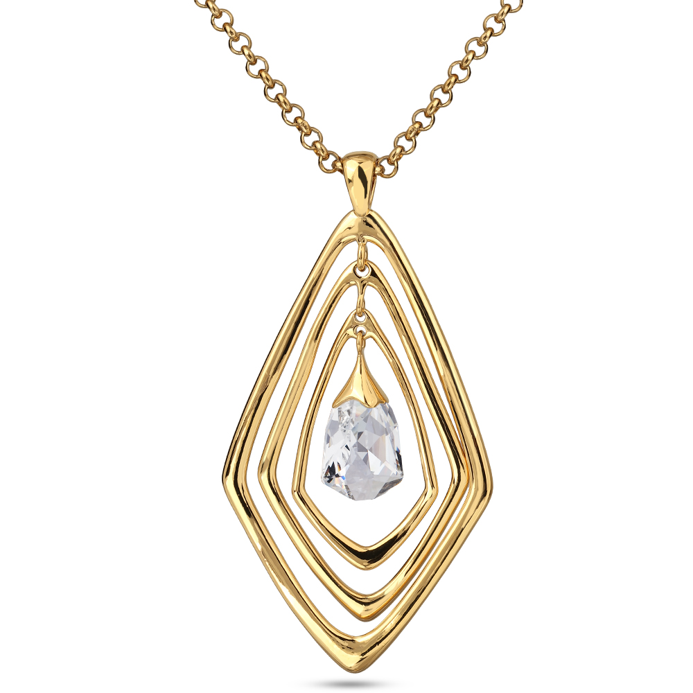 Описание: Изготовлено из ювелирного сплава на основе латуни с гальваническим покрытием золотом. Изделие украшают кристаллы SW белого цвета. Длина цепочки 88см. Замок-карабин с удлинителем 5см. Кулон 8х4см.