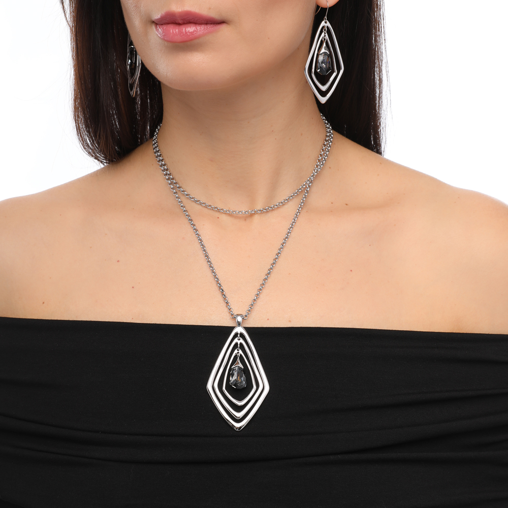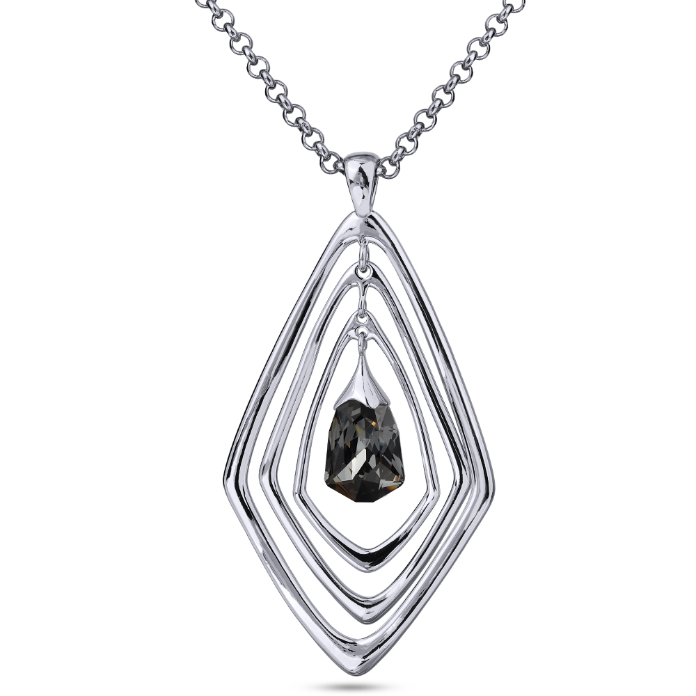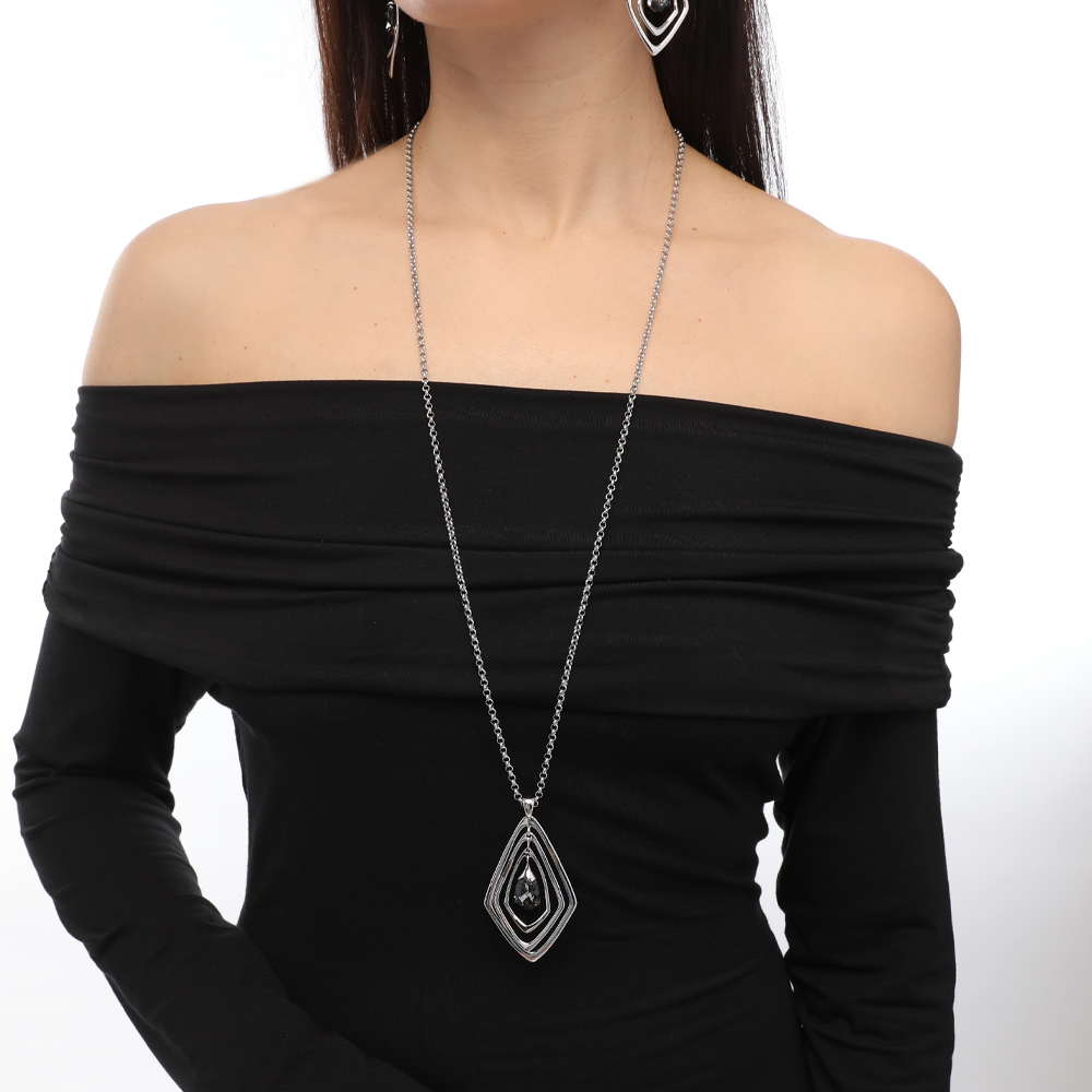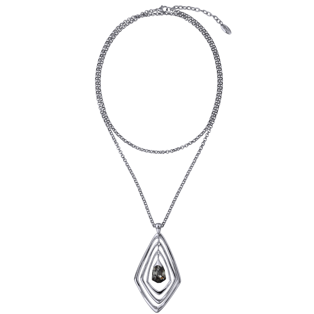 Описание: Изготовлено из ювелирного сплава на основе латуни с гальваническим покрытием родием. Изделие украшают кристаллы SW темно-серого цвета. Длина цепочки 88см. Замок-карабин с удлинителем 5см. Кулон 8х4см.