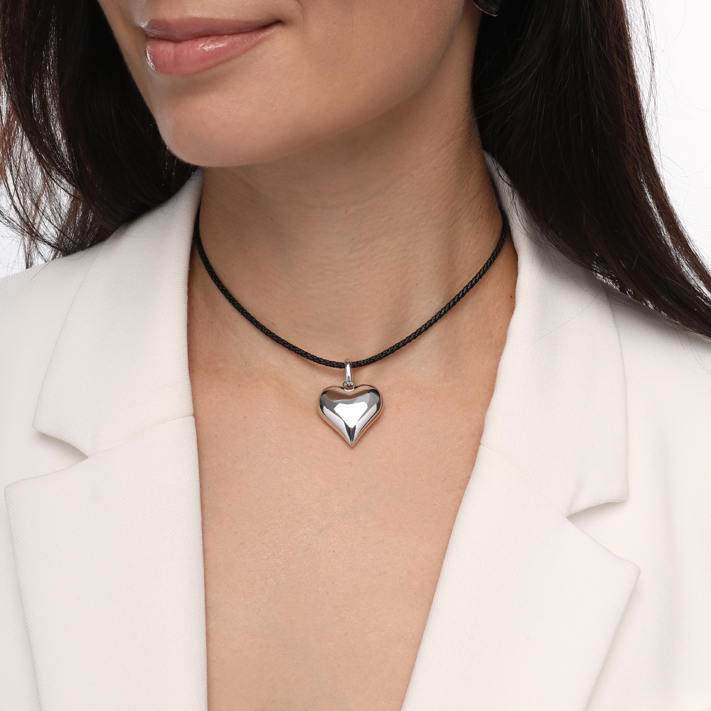 Описание: Изготовлено из ювелирного сплава на основе латуни с гальваническим покрытием родием. Размер кулона 2.5х2.5см. Длина черного кожанного шнурка 38см. Замок удлинитель 7см.