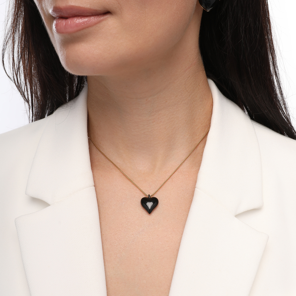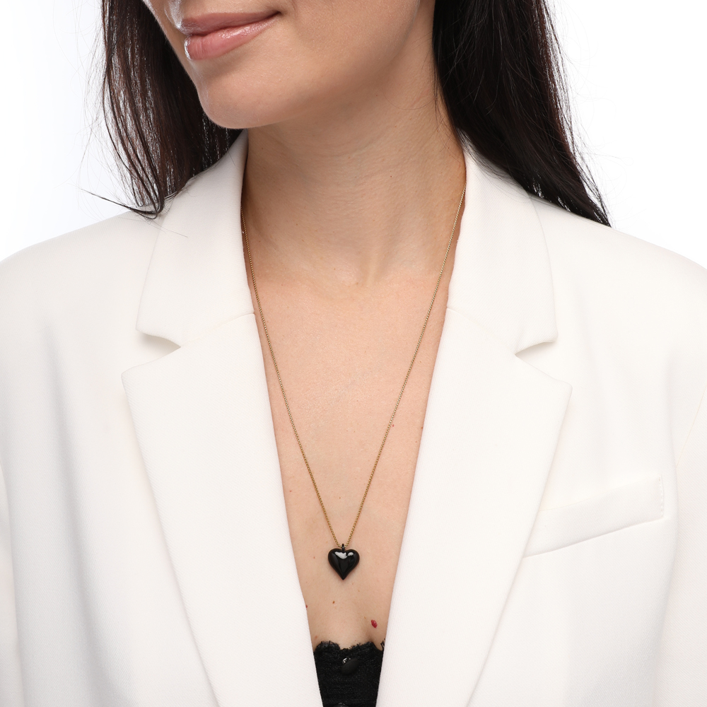 Описание: Изготовлено из ювелирного сплава на основе латуни с гальваническим покрытием золотом. Изделие украшает черная эмаль. Размер кулона 1.6х1.6см. Длина цепочки 82см.