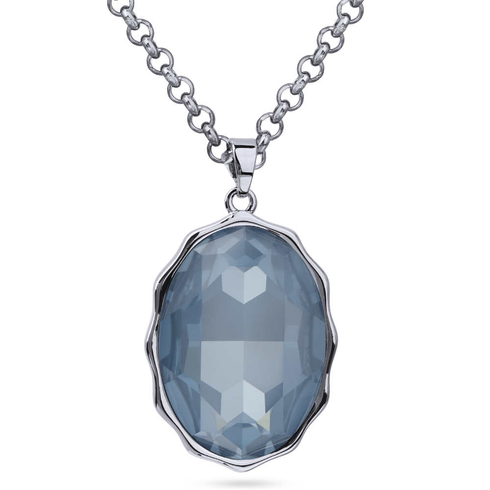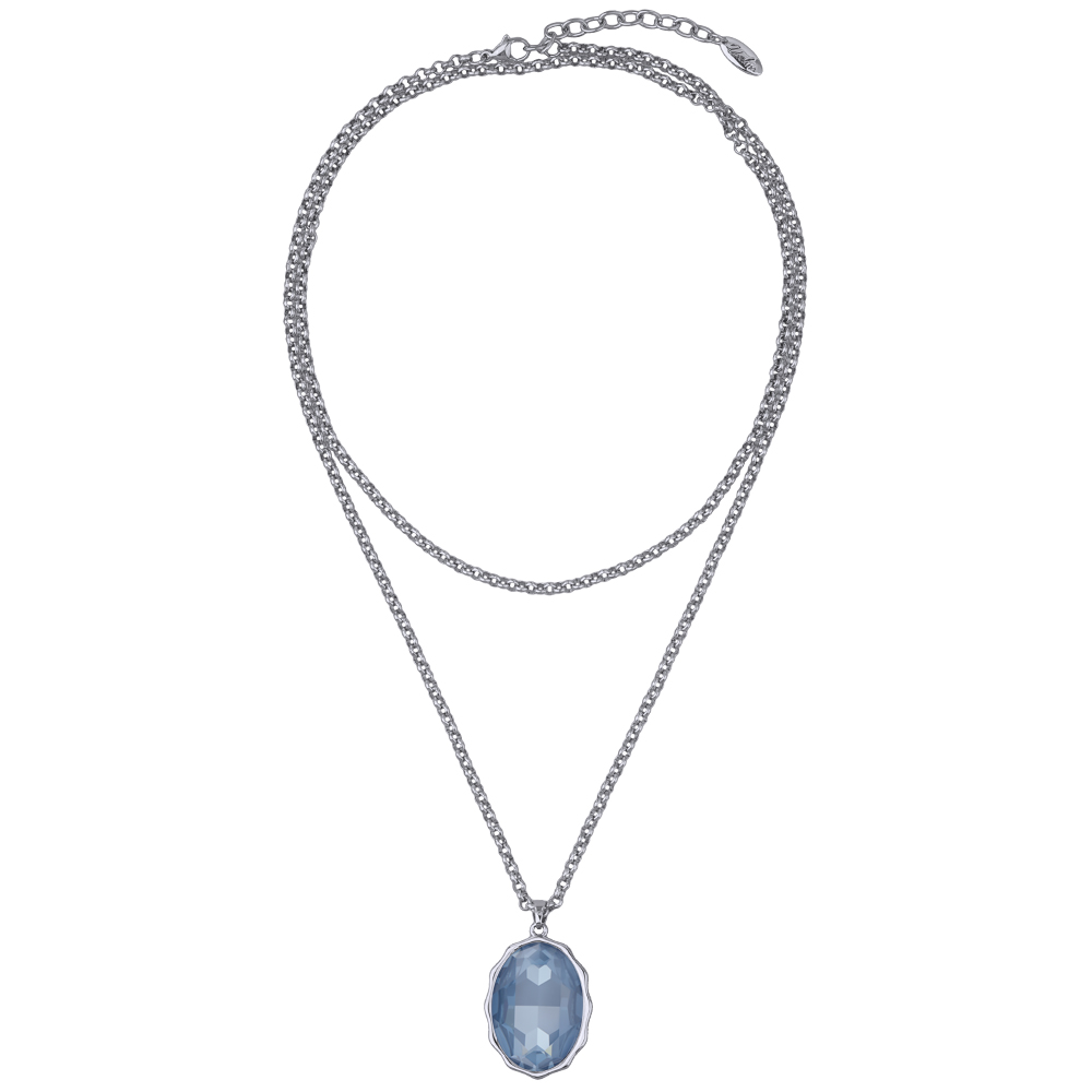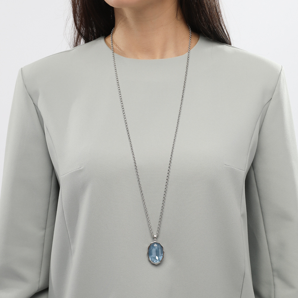 Описание: Изготовлено из ювелирного сплава на основе латуни с гальваническим покрытием родием. Изделие украшают кристаллы SW цвета байкальский лед. Длина цепочки 90см. Замок-карабин с удлинителем 5см. Размер кулона 30х20мм.