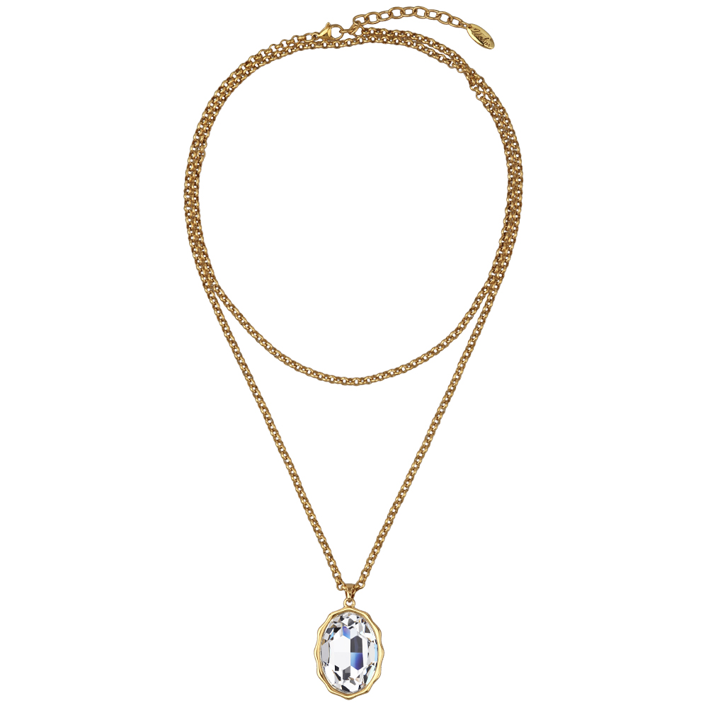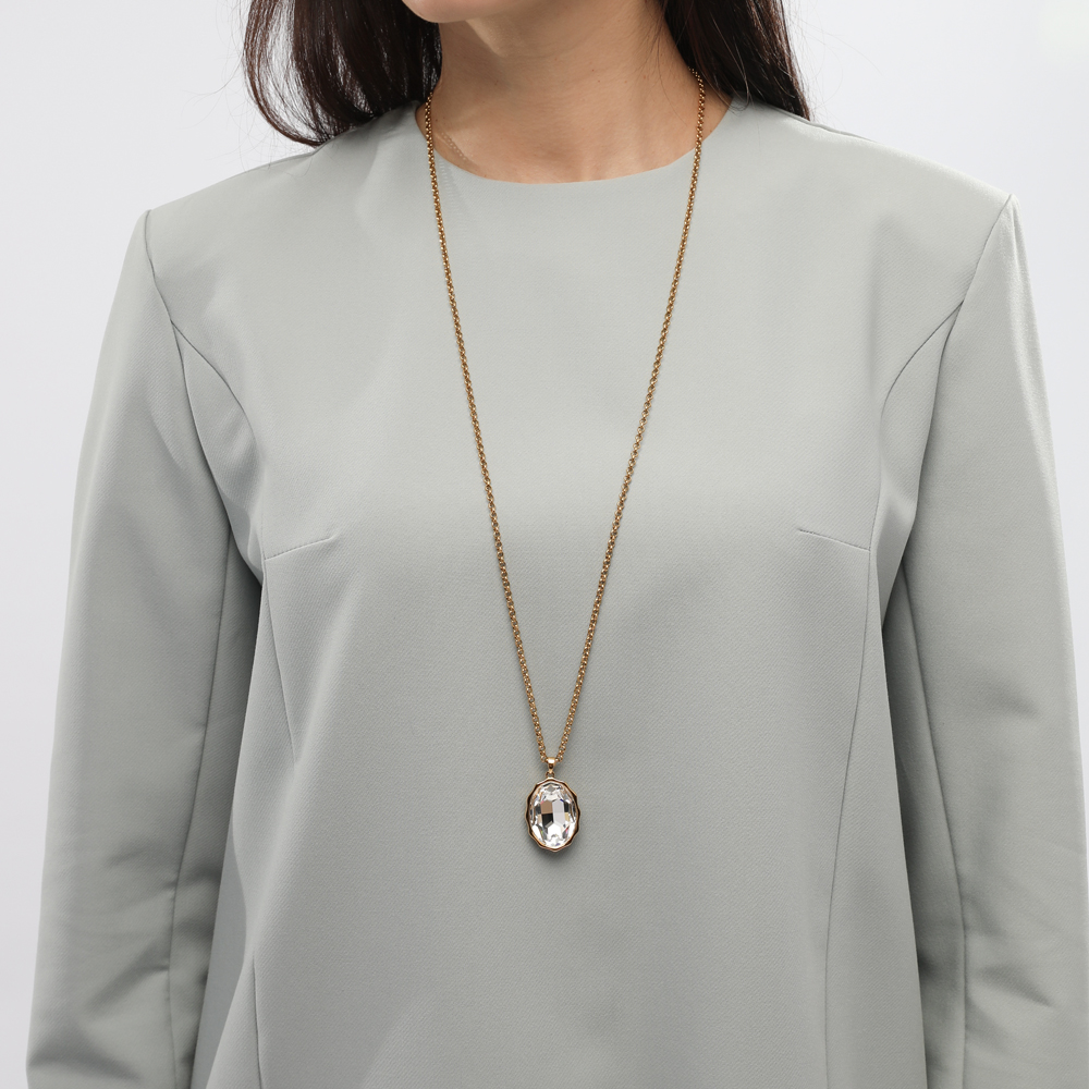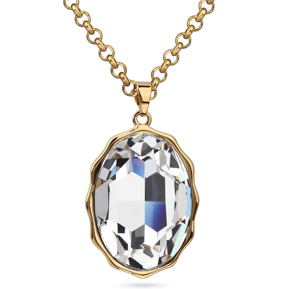 Описание: Изготовлено из ювелирного сплава на основе латуни с гальваническим покрытием золотом. Изделие украшают кристаллы SW белого цвета. Длина цепочки 90см. Замок-карабин с удлинителем 5см. Размер кулона 30х20мм.