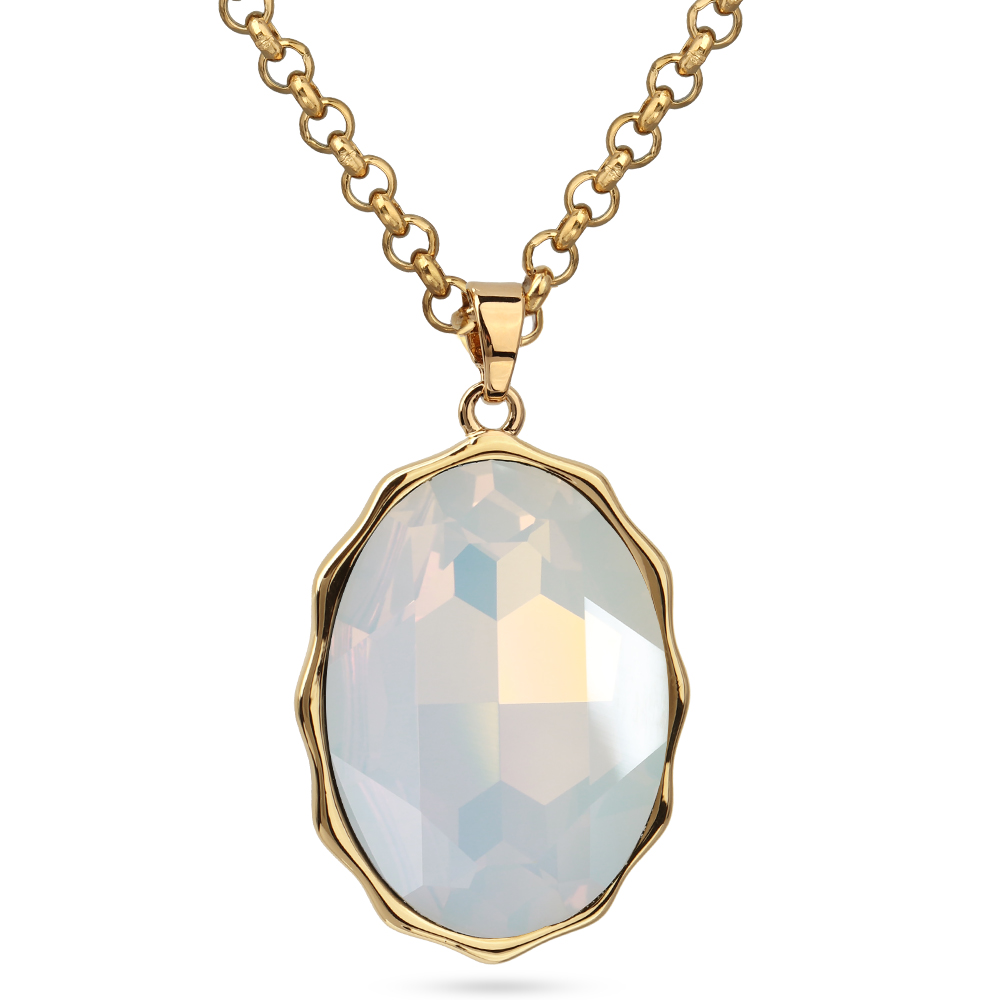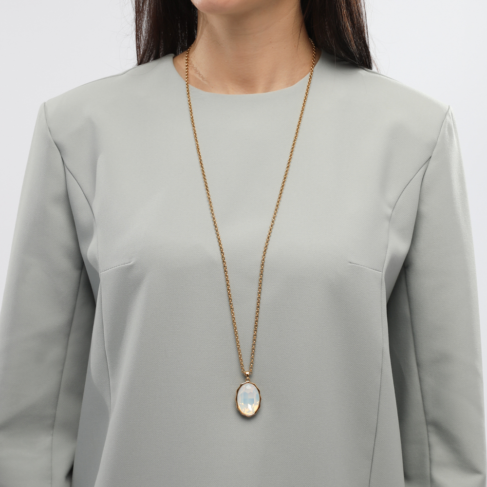 Описание: Изготовлено из ювелирного сплава на основе латуни с гальваническим покрытием золотом. Изделие украшают кристаллы SW цвета белый опал. Длина цепочки 90см. Замок-карабин с удлинителем 5см. Размер кулона 30х20мм.