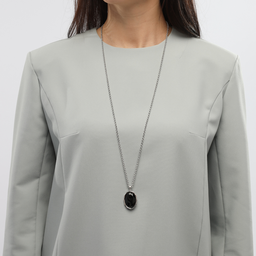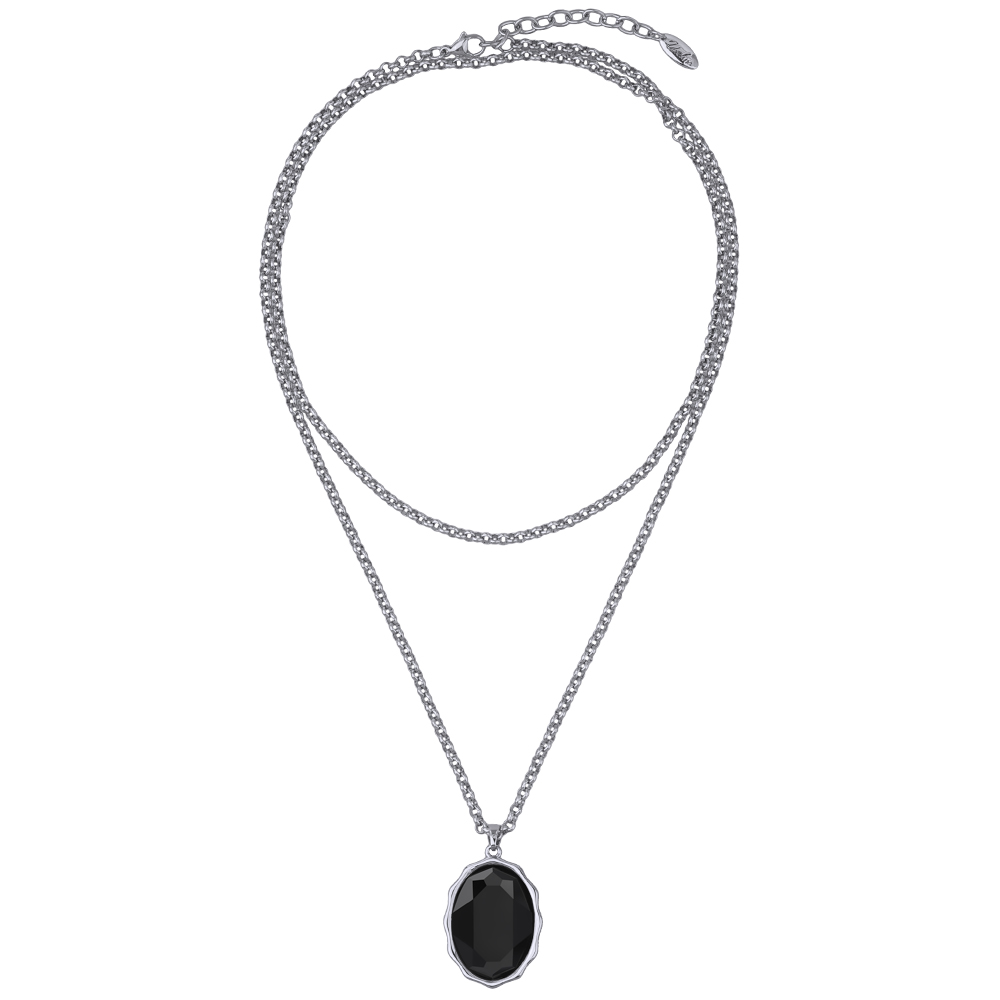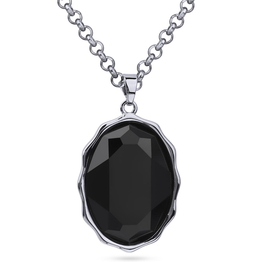 Описание: Изготовлено из ювелирного сплава на основе латуни с гальваническим покрытием родием. Изделие украшают кристаллы SW черного цвета. Длина цепочки 90см. Замок-карабин с удлинителем 5см. Размер кулона 30х20мм.