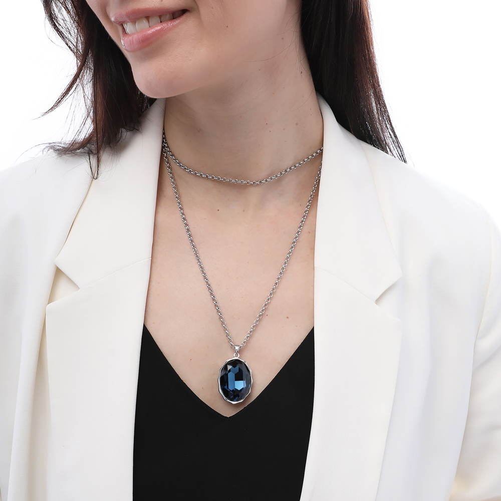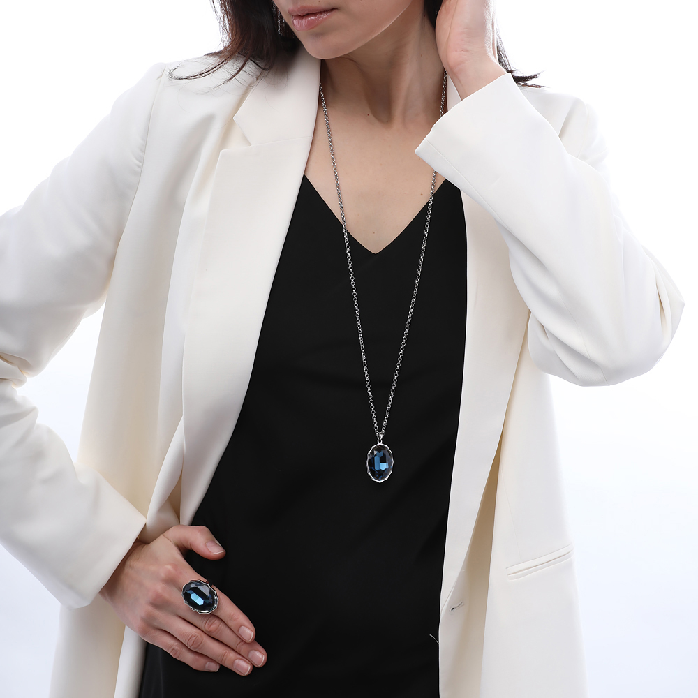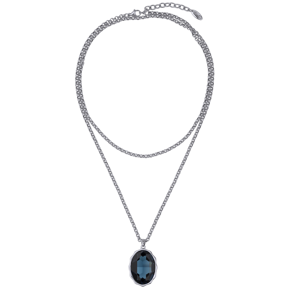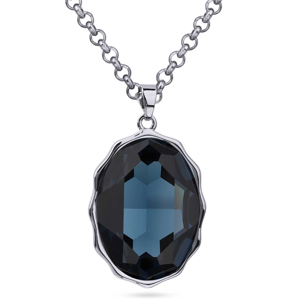 Описание: Изготовлено из ювелирного сплава на основе латуни с гальваническим покрытием родием. Изделие украшают кристаллы SW темно-синего цвета. Длина цепочки 90см. Замок-карабин с удлинителем 5см. Размер кулона 30х20мм.