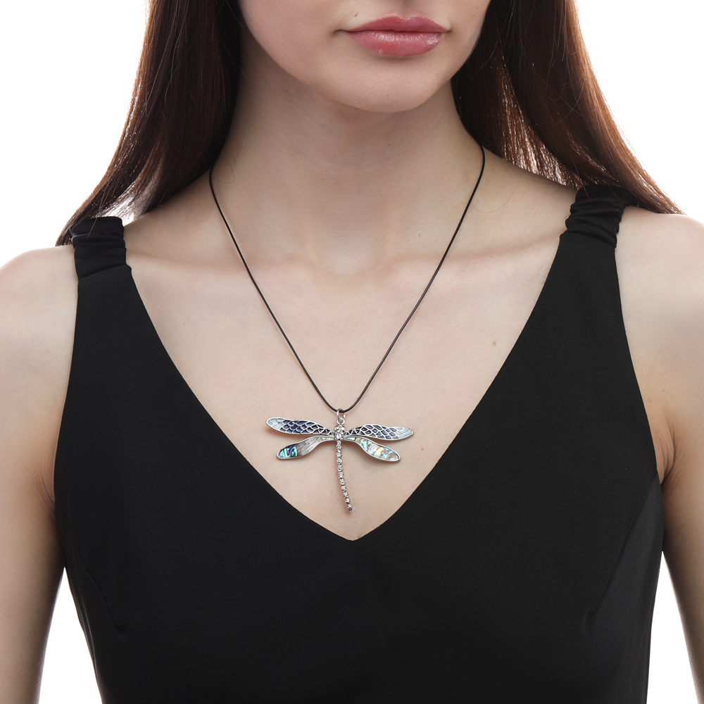 Описание: Изготовлено из ювелирного сплава на основе латуни с гальваническим покрытием родием. Изделие украшено перламуром (гелеотис) и вручную расписано ювелирной краской синего и голубого цвета, покрыто эмалью. Длина черного кожаного шнурка 50 см. Замок-карабин с