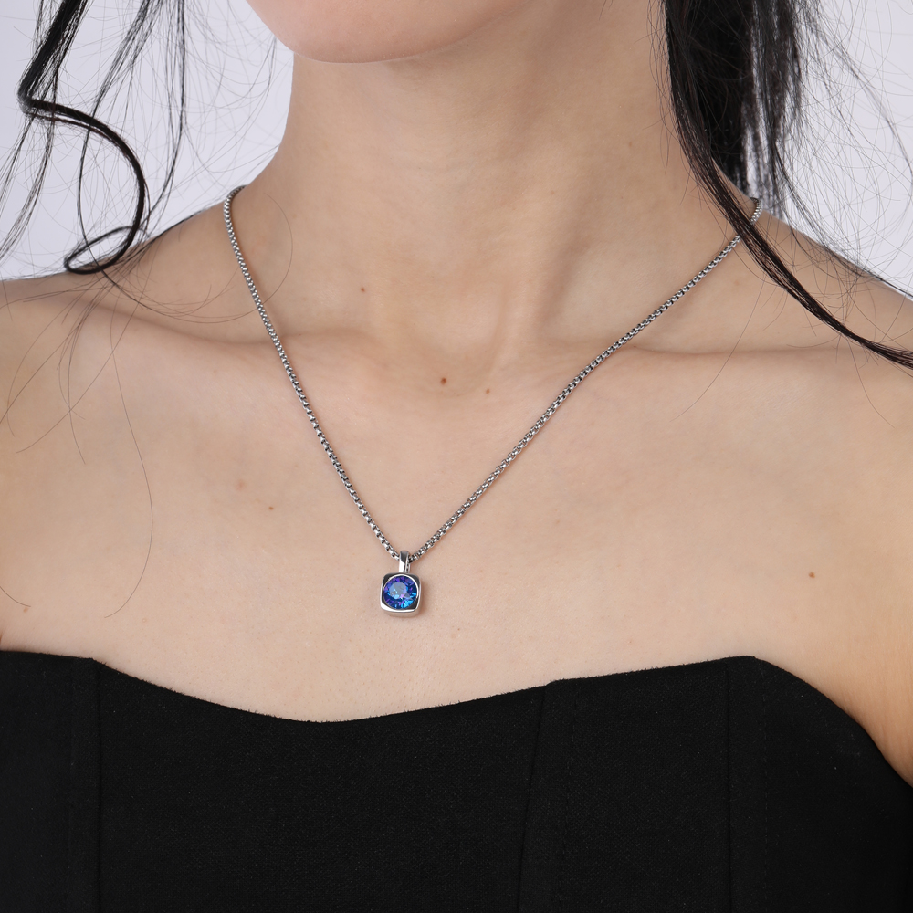 Описание: Изготовлено из ювелирного сплава на основе латуни с гальваническим покрытием родием. Изделие украшают кристаллы SW королевского синего цвета диаметром 8мм. Размер кулона 1.5х1см. На цепочке установлен бегунок регулировки длины. Максимальная длина 70см.